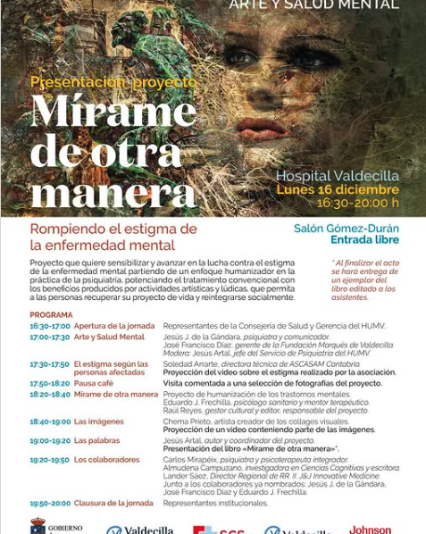 El lunes 16 de diciembre a las 16:30 h tendrá lugar una jornada en la que se presentará el proyecto “Mírame de otra manera: rompiendo el estigma de la enfermedad mental”. La cita tendrá lugar en el salón Gómez Durán del Hospital Marqués de Valdecilla, con entrada libre.
