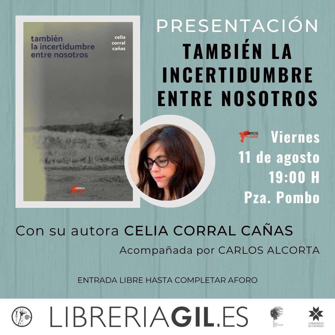 El viernes 11 de agosto, a las 19:00 h. tendrá lugar en Librería Gil la presentación de “También la incertidumbre entre nosotros”, de Celia Corral Cañas. Durante la presentación, la autora estará acompañada por Carlos Alcorta.