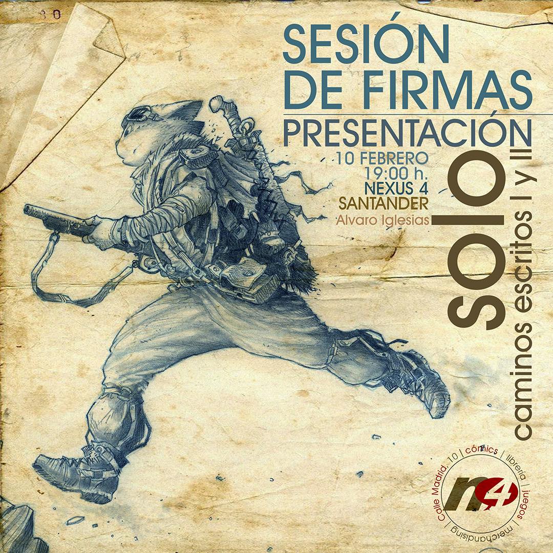 Álvaro Iglesias presenta este viernes 10 de febrero, a las 19:00 h, su última obra, el segundo volumen de “Sólo, Caminos escritos”, que desarrolla una historia paralela a la trama del popular personaje creado por Oscar Martín, ‘Solo’. “Caminos escritos”, de Oscar Martín al guión y con el arte de Álvaro Iglesias, profundiza en el universo tan particular creado por el primero; un universo catastrófico, poblado de humanos, animales antropomórficos y monstruos que conviven en perpetua lucha, donde el clima y el paisaje son extremos. La presentación tendrá lugar en la librería especializada Nexus-4 de Santander, dentro de las diversas actividades de difusión del cómic organizadas en colaboración con la Asociación ‘Amigos de la Narración Gráfica’.