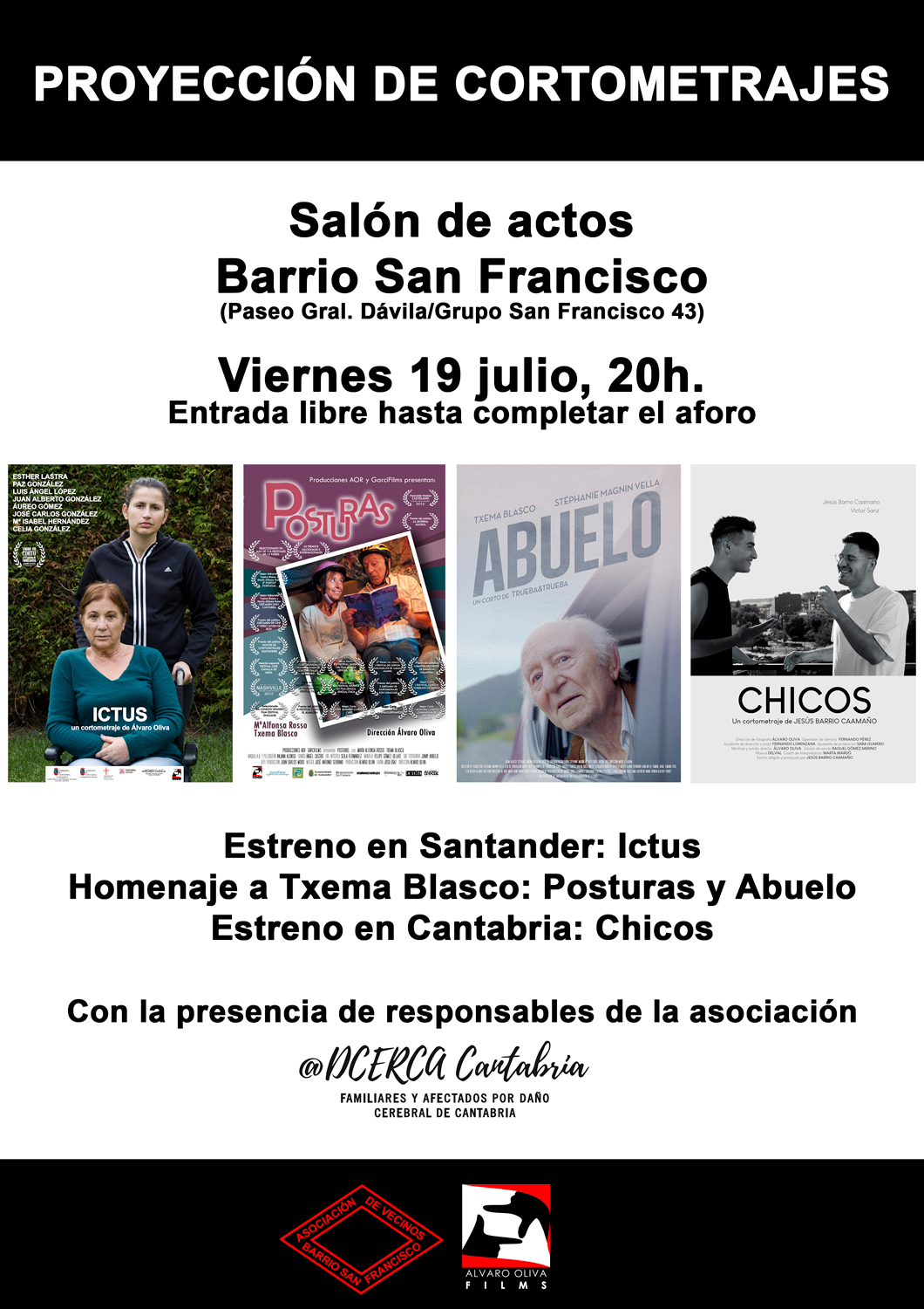 El primero de ellos será “Ictus”, corto documental de Álvaro Oliva, que acaba de ganar el Premio Dobra en el XXV Torre en corto, Festival de Torrelavega. Estarán presentes miembros de la asociación DCerca Cantabria (familiares y afectados por daño cerebral de Cantabria).