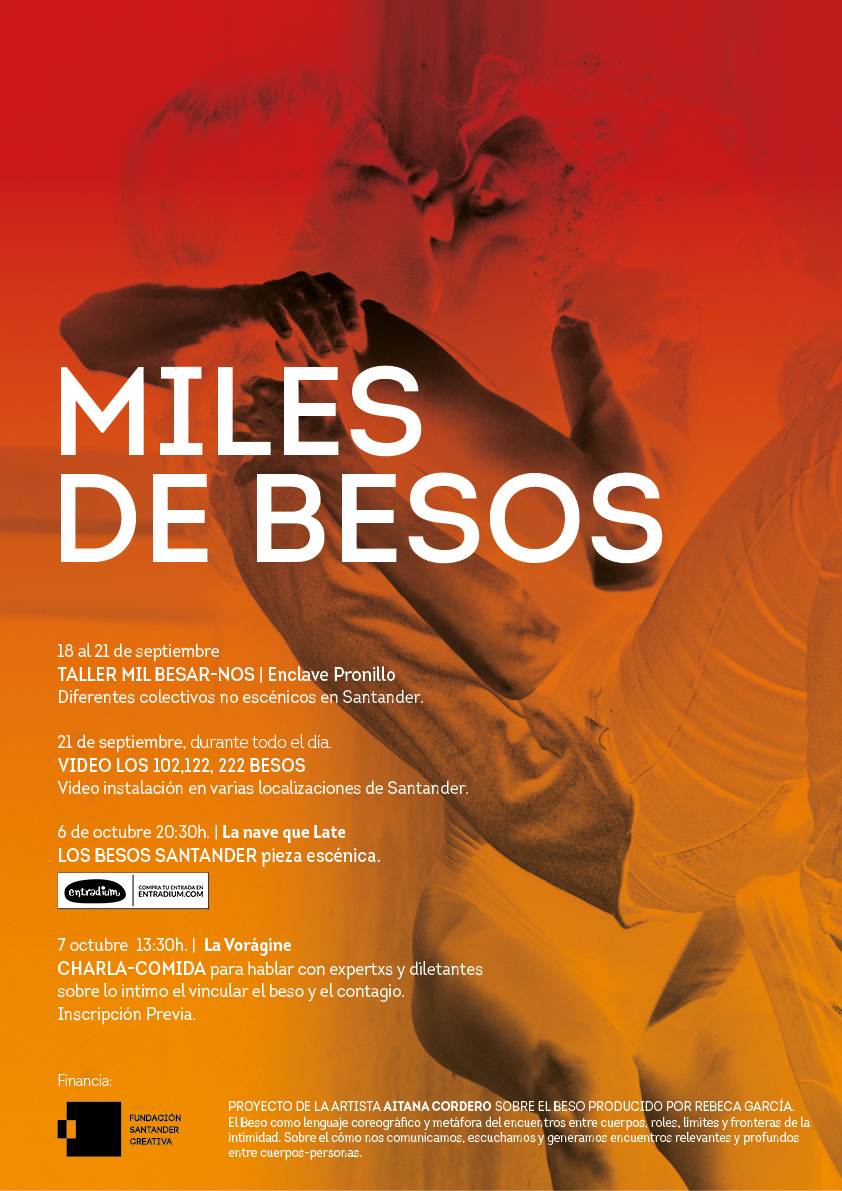 Este vídeo surge como un paso más en la investigación de la coreógrafa madrileña Aitana Cordero sobre el acto de besar y el beso como lenguaje coreográfico. Una metáfora sobre el cómo nos comunicamos, escuchamos y generamos encuentros relevantes y profundos entre cuerpos-personas. El jueves 21 de septiembre esta pieza se proyectará durante todo el día en Enclave Pronillo, Espacio Joven, La Vorágine, bar Canela, librería Gil y en la Naves de Gamazo.