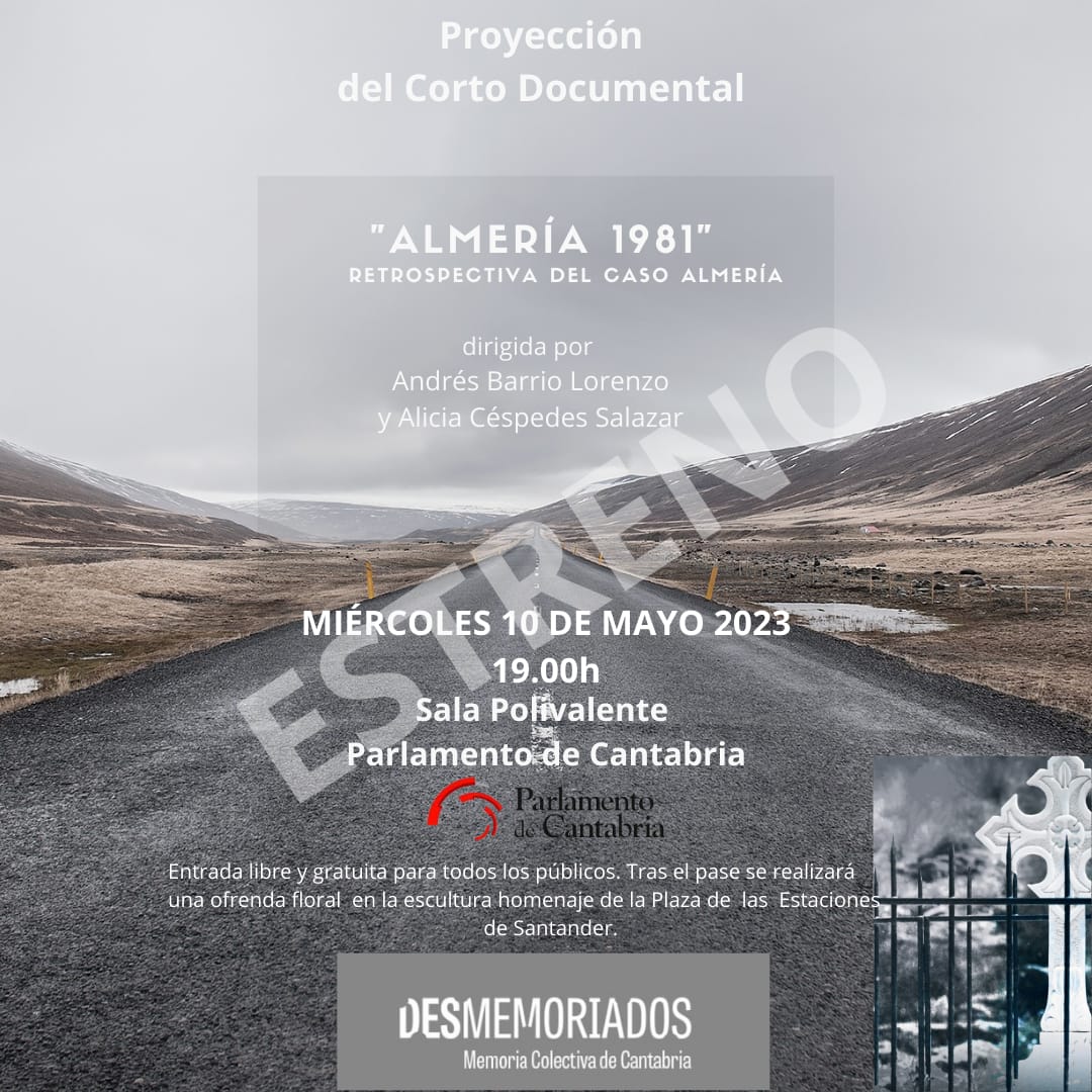 El miércoles 10 de mayo en el 42º aniversario del crimen, Desmemoriados vuelve al Parlamento de Cantabria, -sala polivalente- con un nuevo acto de homenaje a las víctimas. A las 19 horas, se estrena el corto documental “Almería 1981, retrospectiva del caso Almería”, de Andrés Barrio y Alicia Céspedes, en el que ha colaborado la asociación.
