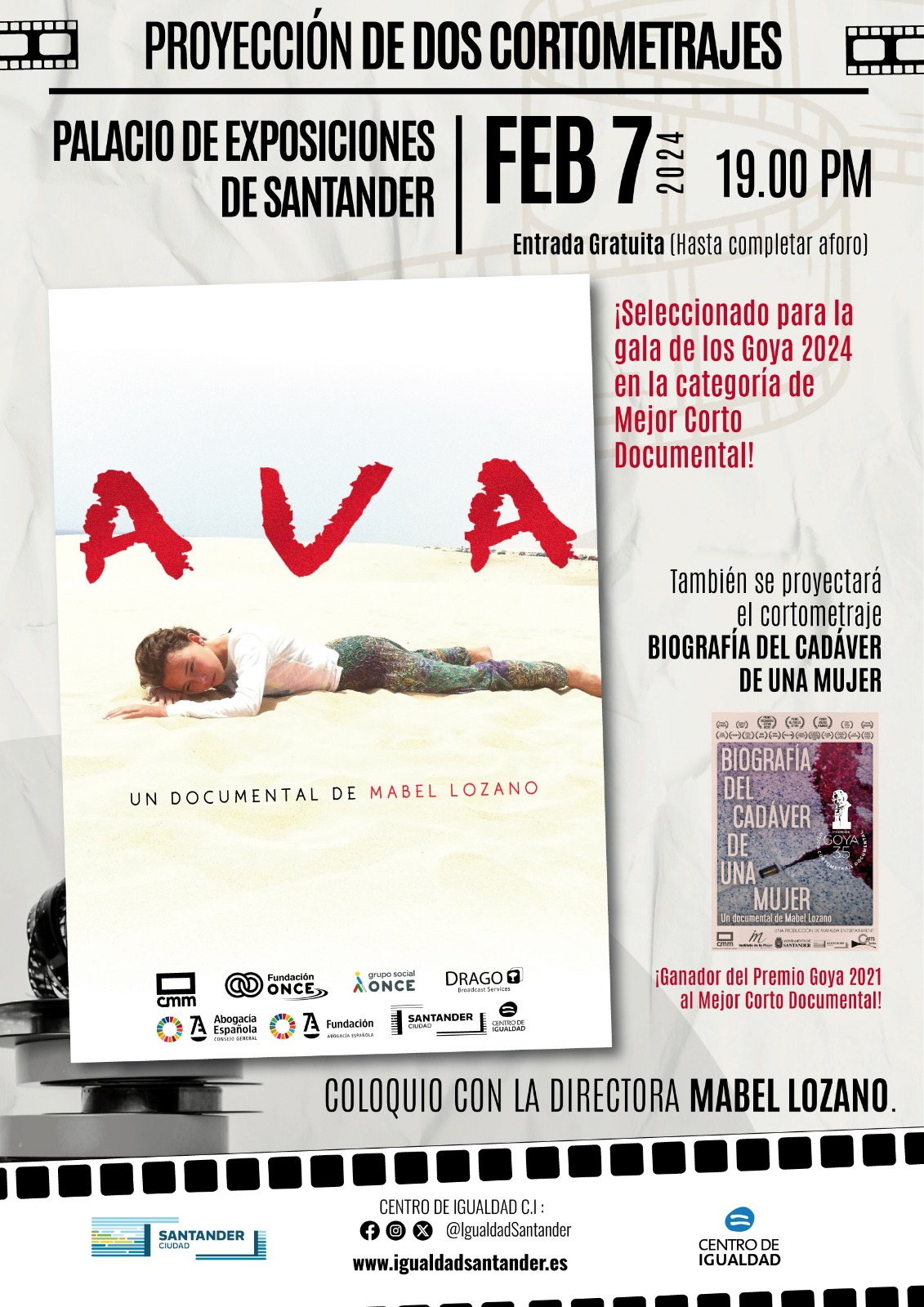 El Palacio de Exposiciones de Santander acoge el miércoles 7 de febrero, a partir de las 19.00 horas, la proyección del cortometraje nominado para los Goya 2024 “AVA” así como del ganador del Goya 2021 al mejor corto documental “Biografía del cadáver de una mujer”, ambos patrocinados por el Ayuntamiento de Santander y dirigidos por Mabel Lozano, que estará presente en el acto.