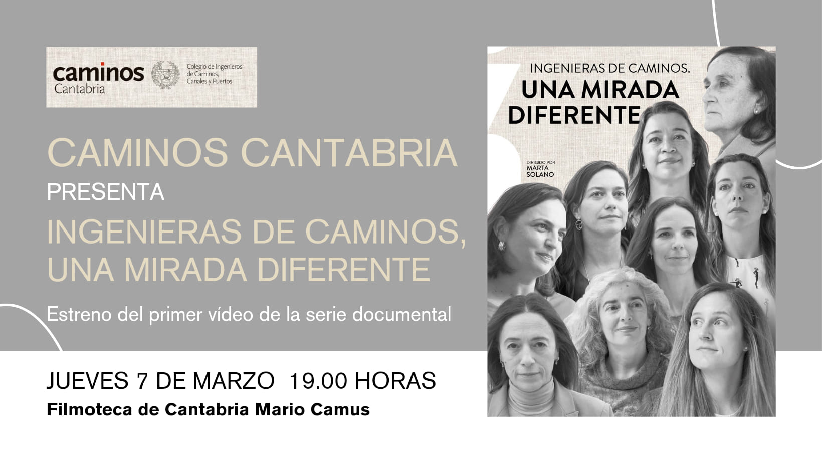 La Demarcación de Cantabria del Colegio de Ingenieros de Caminos, Canales y Puertos celebra el Día Internacional de la Mujer con el estreno de una serie documental donde las protagonistas son nueve colegiadas que exponen, a través de su mirada, el inicio, el cambio y el futuro de la Ingeniería de Caminos desde la incorporación de la mujer a la profesión. La presentación del proyecto y la proyección de la primera parte del documental tendrá lugar este jueves, 7 de marzo, a partir de las 19.00 horas, en la Filmoteca de Cantabria, con entrada libre hasta completar aforo.