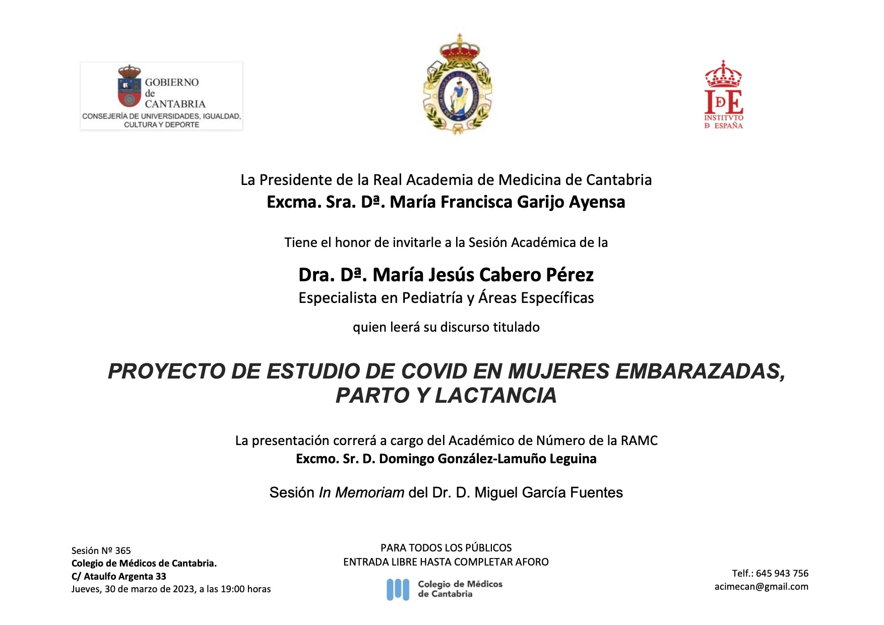 La Real Academia de Medicina de Cantabria organiza la sesión académica en la que Mª Jesús Cabero leerá su discurso titulado “Proyecto de estudio de Covid en mujeres embarazadas, parto y lactancia”.