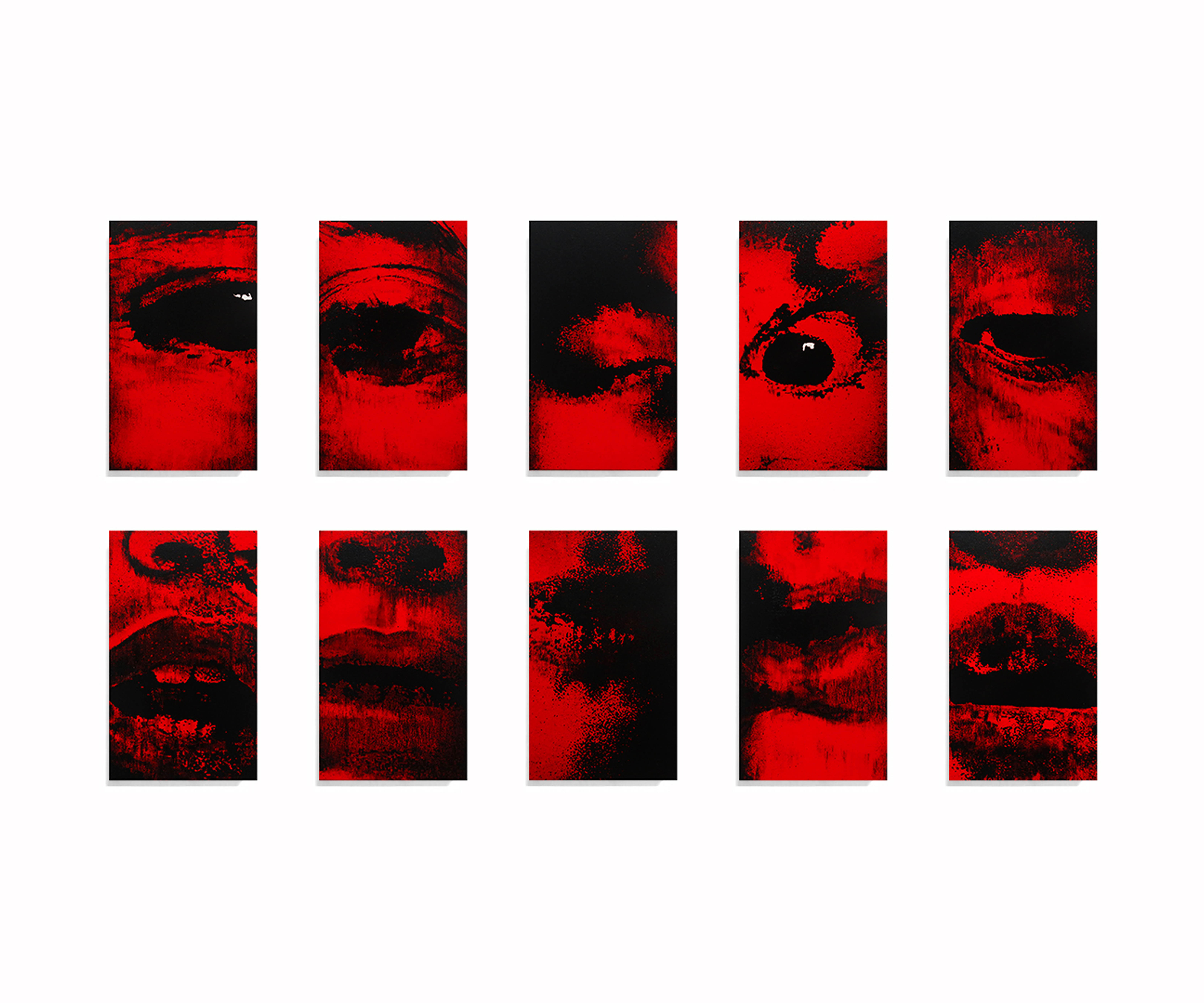 Quique Ortiz: Sin título, 2024. Políptico. Acrílico, serigrafía y óleo en barra sobre lienzo. Dimensiones variables.