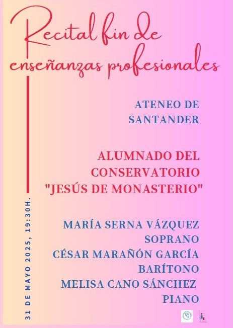 El Ateneo de Santander acoge durante este mes varios recitales de alumnos que finalizan sus estudios en el conservatorio Jesús de Monasterio. El sábado 31 de mayo a las 19:30h será el turno de la soprano María Serna y el barítono César Marañón, acompañados al piano por Melisa Cano.
