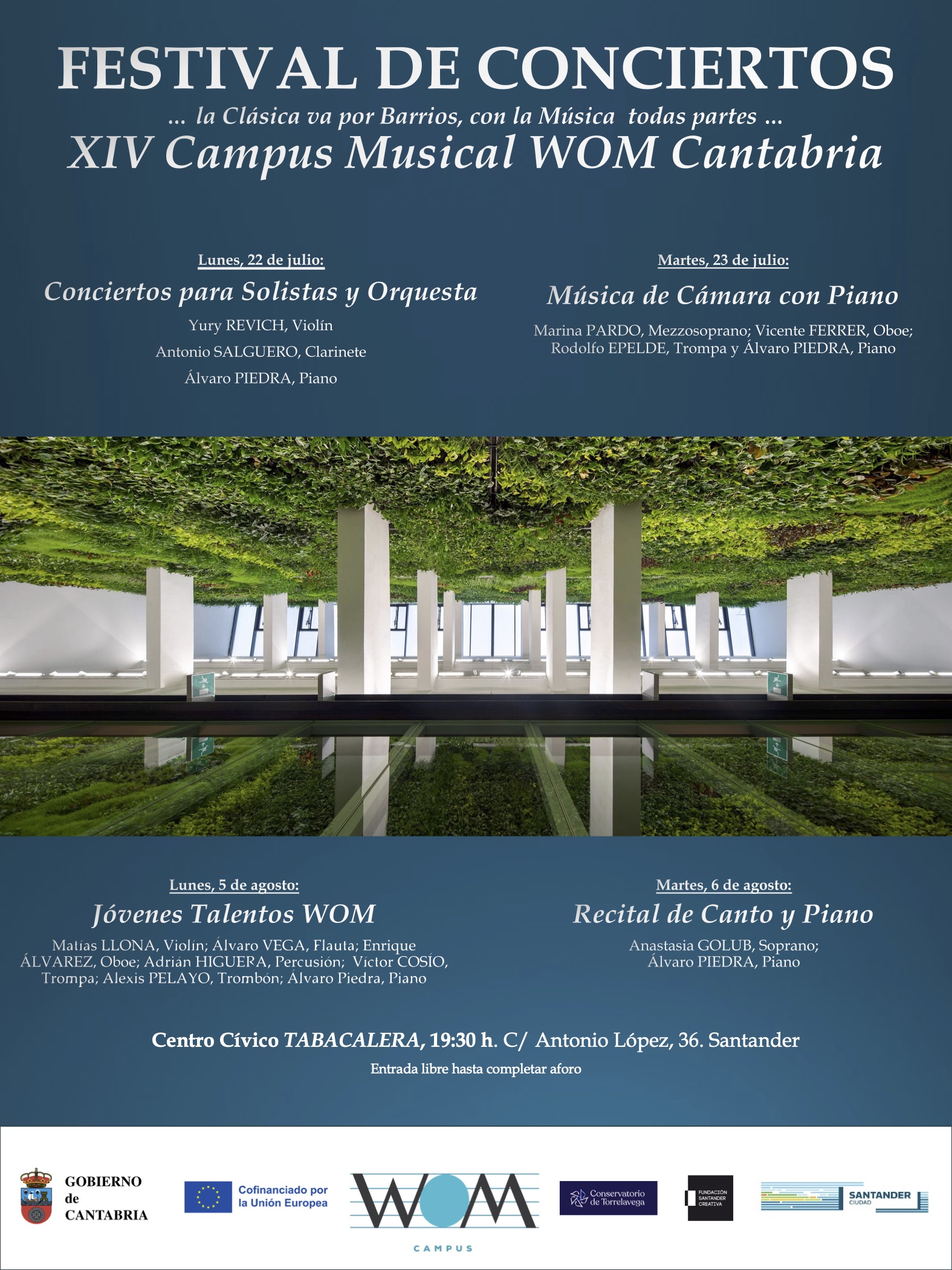 La decimocuarta edición del Campus Musical WOM se celebra en Laredo del 14 al 28 de julio. Esta escuela-orquesta itinerante reúne todos los años a un selecto conjunto de concertistas y profesores que imparten clases magistrales a estudiantes de toda España y realizan ensayos con ellos para, más tarde, ofrecer conciertos de música clásica de diversos estilos y formaciones en distintos puntos de Cantabria.