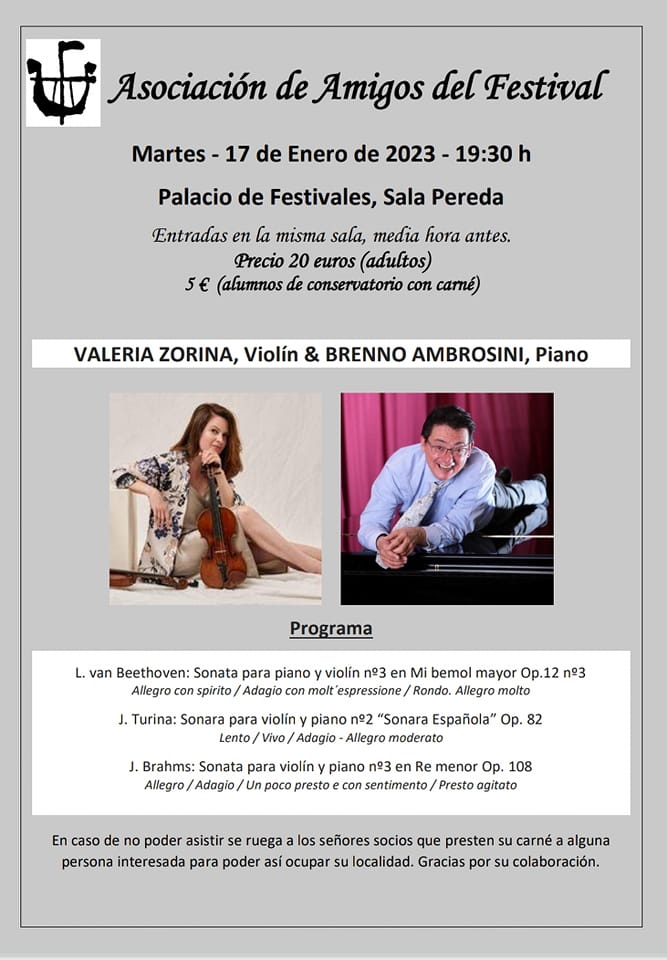 La Asociación de Amigos del Festival Internacional de Santander ha programado este recital que contará con la participación de Valeria Zorina al violín y Brenno Ambrosini al piano.