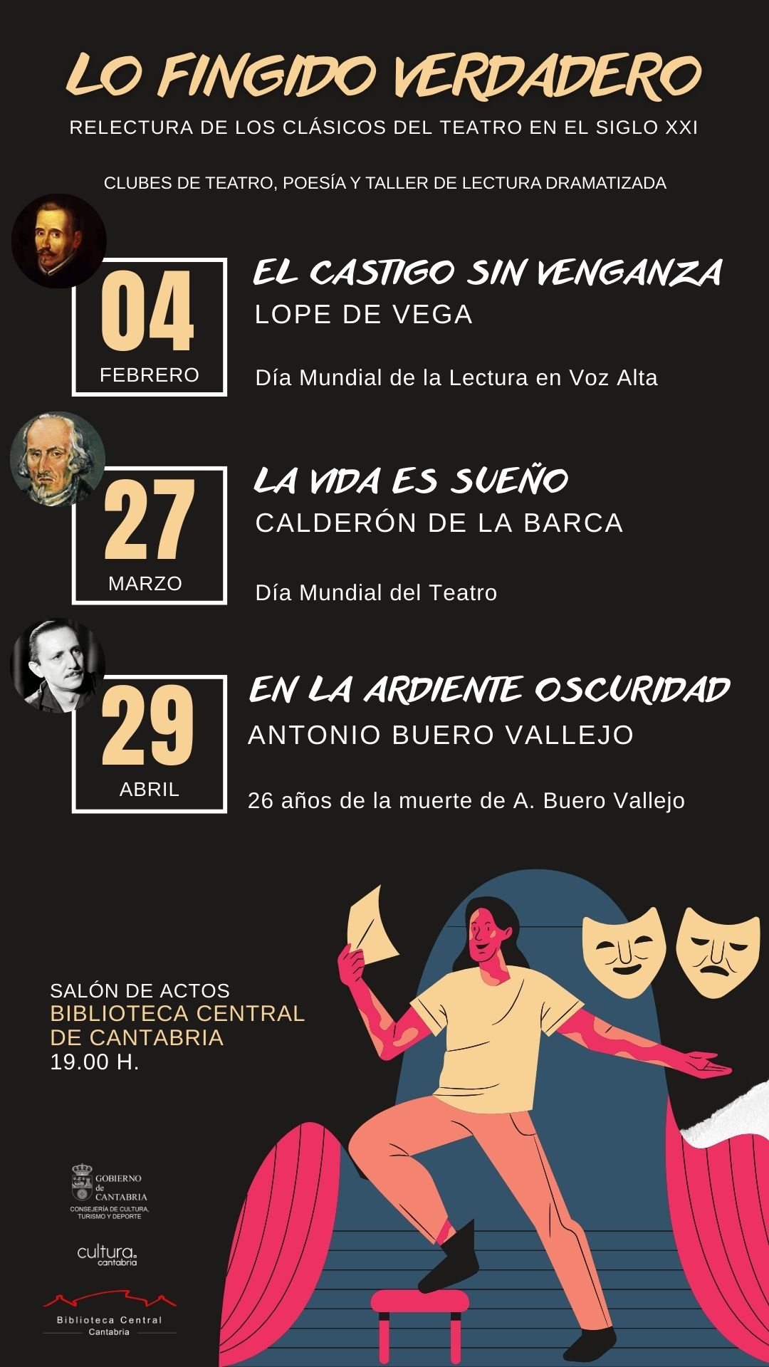 La Biblioteca Central de Cantabria pone en marcha entre los meses de febrero y abril la actividad «Lo fingido verdadero», un ciclo de lecturas de clásicos del teatro español a través de tres autores y tres obras de los siglos XVII y XX imprescindibles que anticipan una experiencia muy enriquecedora.