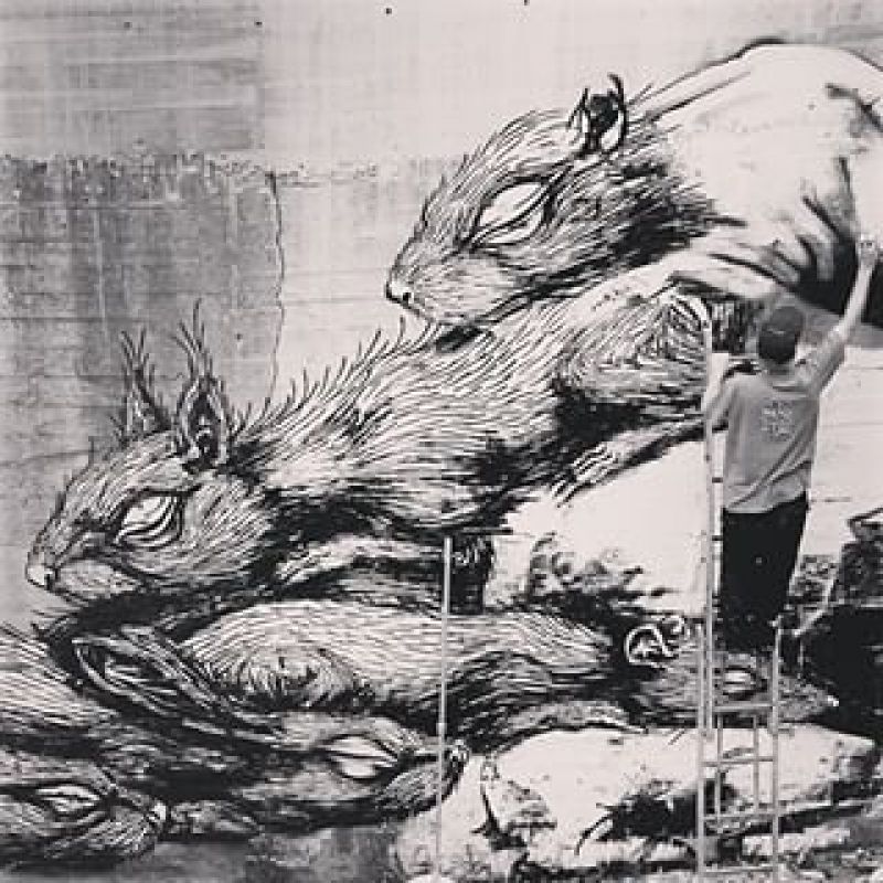 Asentado en Gante, este creador es conocido por plasmar animales gigantes en blanco y negro. Comenzó a pintar en edificios abandonados y almacenes industriales y ahora sus obras pueden verse en ciudades de todo el mundo. Londres, Berlín, París, Varsovia y Nueva York son solo algunos ejemplos.