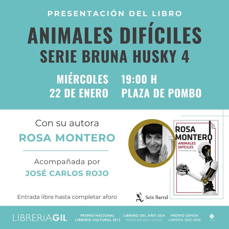El miércoles 22 de enero, a las 19:00 h. Rosa Montero se acercará a Librería Gil para presentar “Animales difíciles” (Serie Bruna Husky 4). La escritora estará acompañada por José Carlos Rojo. (Editorial Seix Barral).