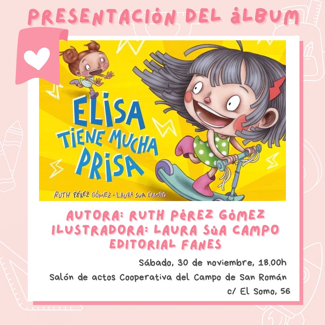 El sábado 30 de noviembre a las 18.00h en el salón de actos de la cooperativa del campo de San Román tendrá lugar la presentación del álbum ilustrado “Elisa tiene mucha prisa”, con la presencia de la autora, Ruth Pérez, y la ilustradora, Laura Súa Campo.