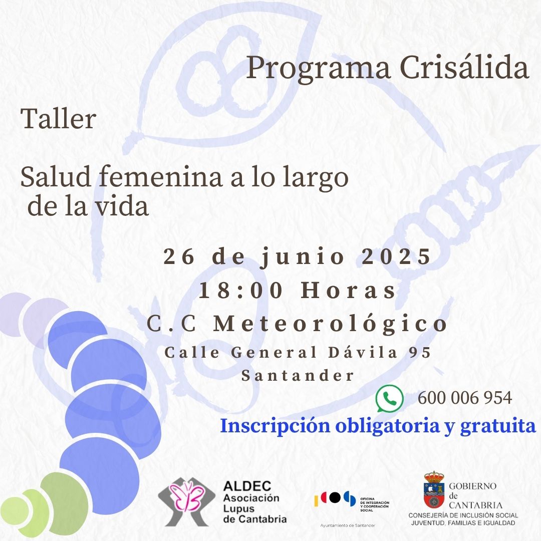 La Asociación Lupus de Cantabria (ALDEC) organiza esta charla y taller sobre “Salud femenina a lo largo de la vida” el jueves 26 de junio a las 18:00h en el Centro Cívico Meteorológico.