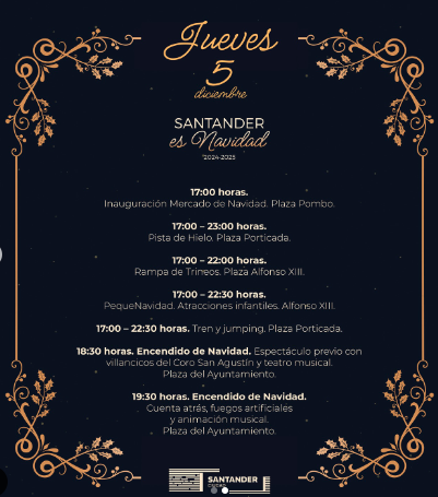 Santander se iluminará el jueves 5 con aproximadamente 3,3 millones de luces led repartidas por toda la ciudad, diferentes figuras 3D, el gran árbol de la Plaza del Ayuntamiento, pinos en diferentes plazas; paquetes de regalo y otras figuras entre otros motivos navideños. Además, aparte de iluminar las zonas más comerciales de la ciudad para ayudar a dinamizar el comercio y la hostelería, gran parte de los barrios tendrán iluminación y motivos navideños con el fin de que los vecinos, vivan donde vivan, sientan la Navidad más cerca que nunca.