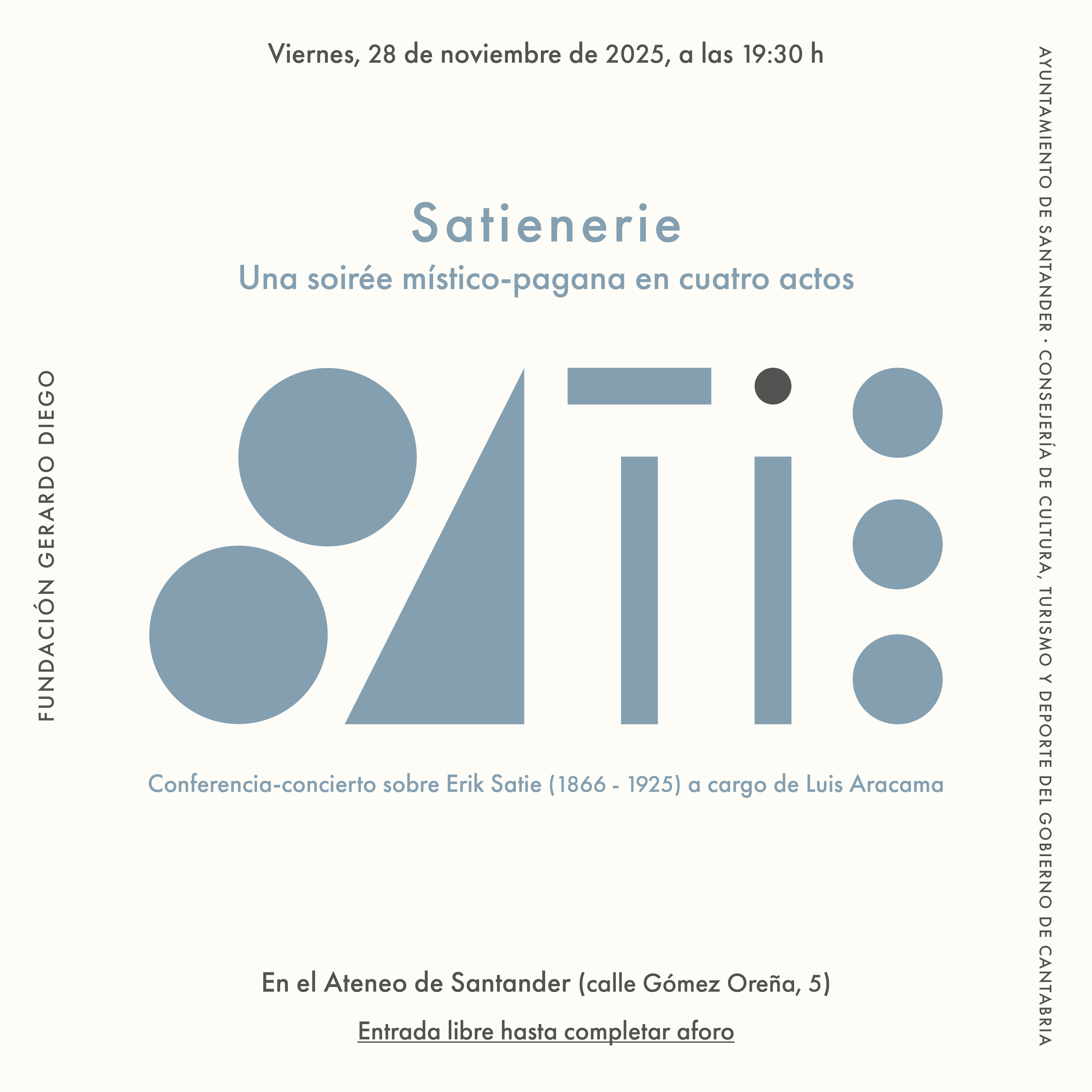 La Fundación Gerardo Diego cierra los actos dedicados a recordar en 2025 a Erik Satie con una conferencia-concierto a cargo de Luis Aracama en el Ateneo de Santander, el viernes 28 de noviembre, a las 19:30 h.