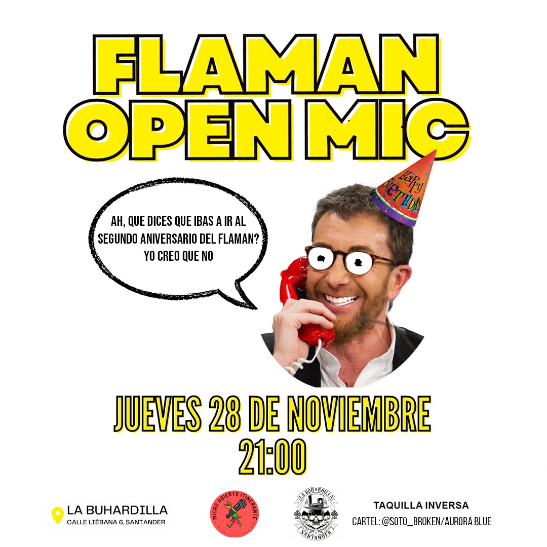 Durante dos años, Flamán Open Mic ha sido un semillero de comediantes y un refugio para los amantes del buen humor. Este aniversario no será la excepción: contará con un cartel estelar de comediantes que ofrecerán lo mejor de sus rutinas, junto con invitados especiales y momentos únicos que no querrás perderte.
