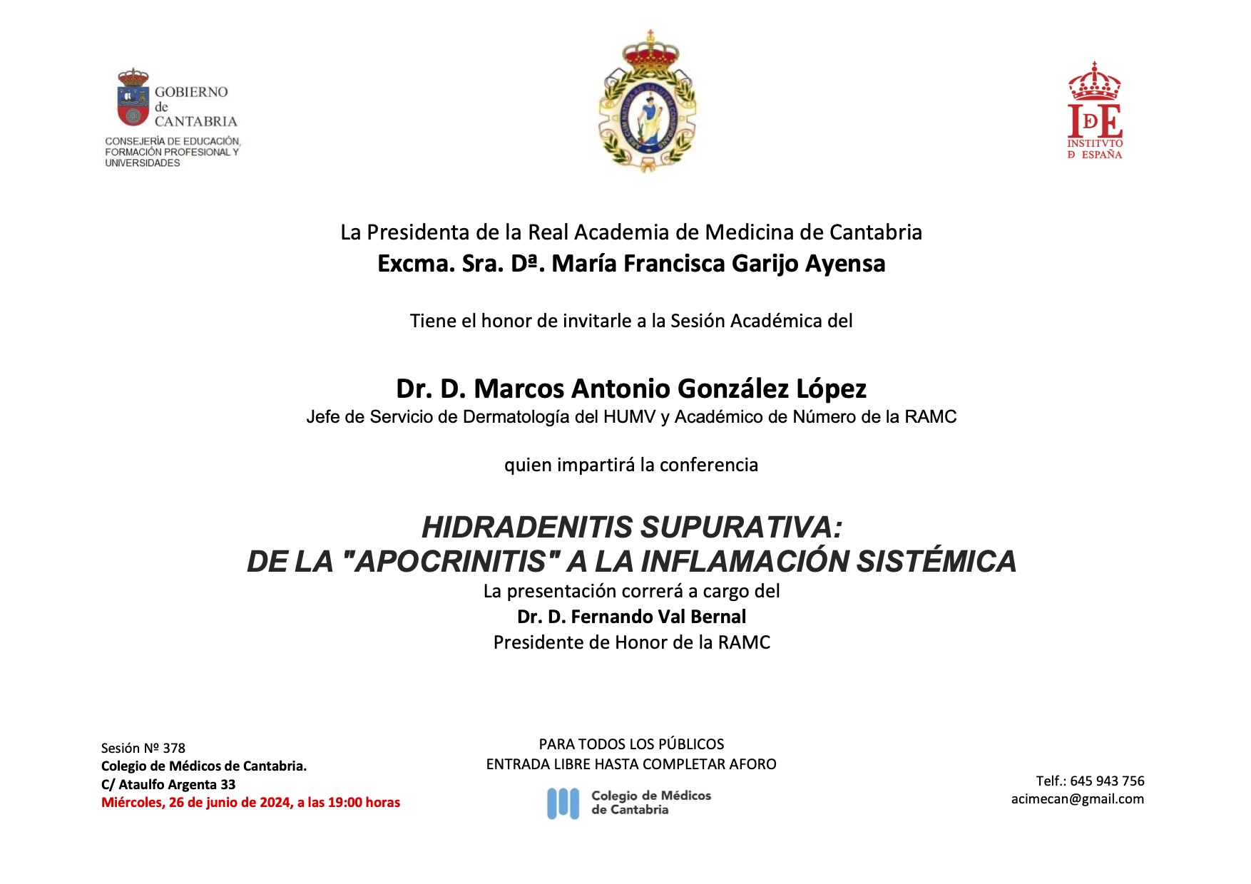 La Real Academia de Medicina de Cantabria celebra una sesión académica en la que Marcos Antonio González López impartirá la conferencia "Hidradenitis supurativa: de la apocrinitis a la inflamación sistémica".