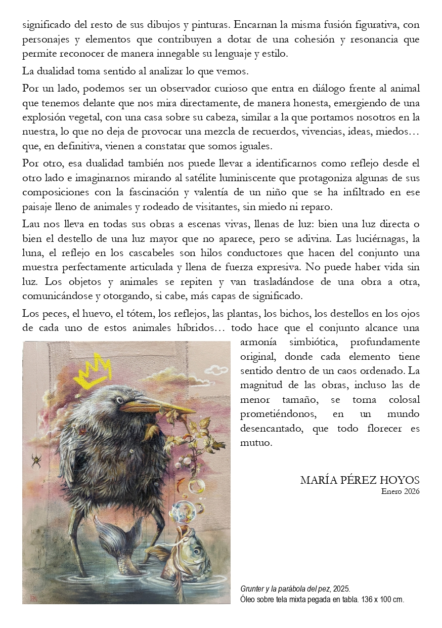Lau Rodríguez tiene un gran dominio de la escala, de la sintonía entre el tamaño de la pincelada y el de la obra, de la composición diminuta o de grandes dimensiones. Hay una intrincada y constante mezcla dominada por lo animal y lo vegetal.