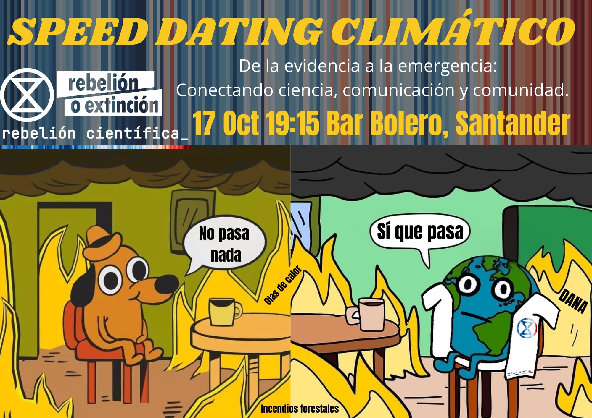 El 19 de octubre a las 19:15h, el Bar Bolero de Santander se convertirá en punto de encuentro para quienes se niegan a mirar hacia otro lado ante el colapso climático. Bajo el título «Speed dating climático: de la evidencia a la emergencia», se celebrará un evento organizado por Rebelión o Extinción que busca unir a vecinas, científicas, activistas y comunicadoras en un formato ágil y cercano.