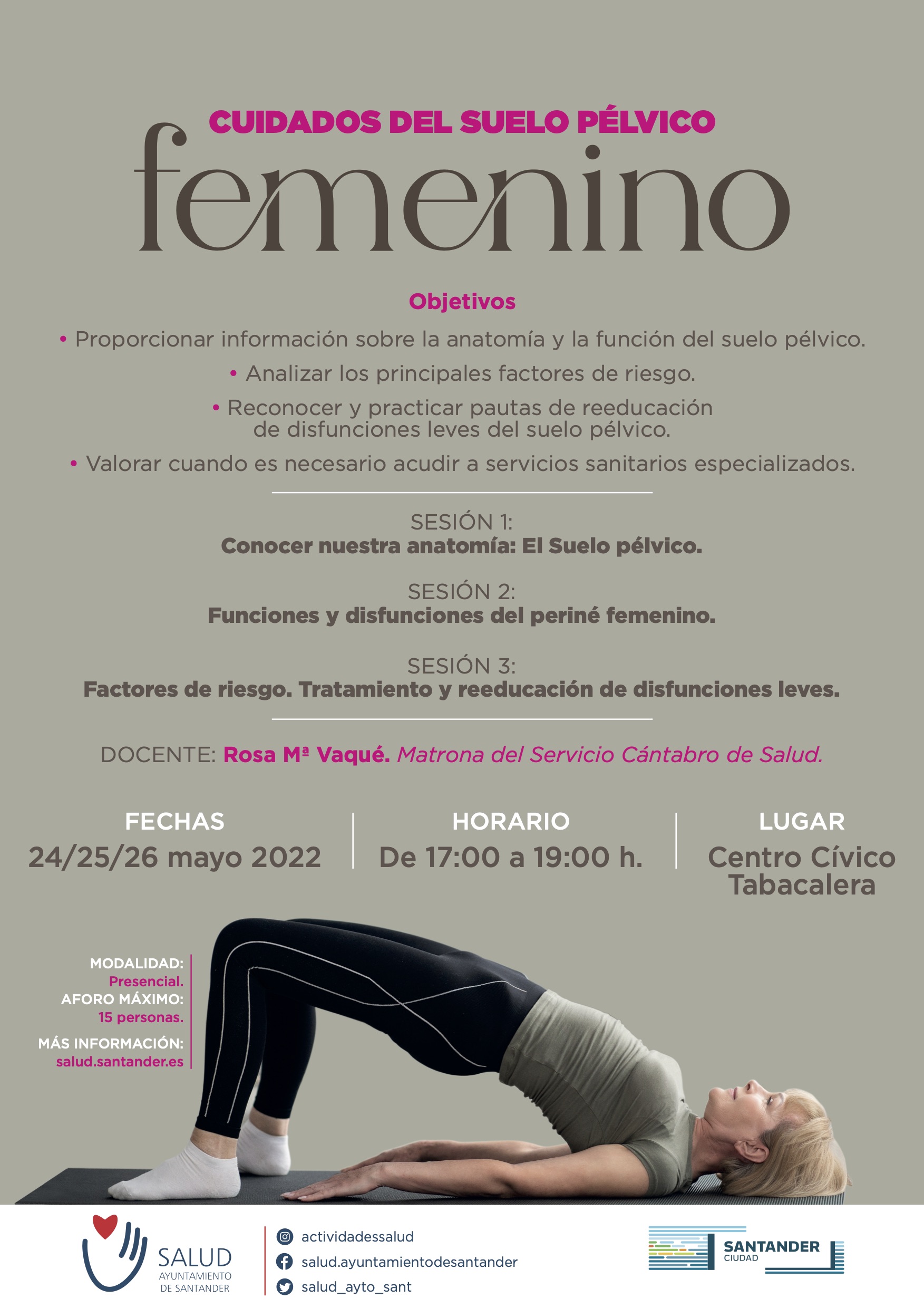 El servicio de Salud del Ayuntamiento de Santander ofrece este taller presencial que consta de tres sesiones impartidas por Rosa Mª Vaqué, matrona del Servicio Cántabro de Salud. Su principal objetivo es mejorar la calidad de vida de las mujeres proporcionando información y formación sobre la anatomía del suelo pélvico y los sistemas de control, sobre los factores asociados a la incontinencia urinaria y sobre los factores de prevención y manejo de la incompetencia del suelo pélvico y de sus consecuencias.