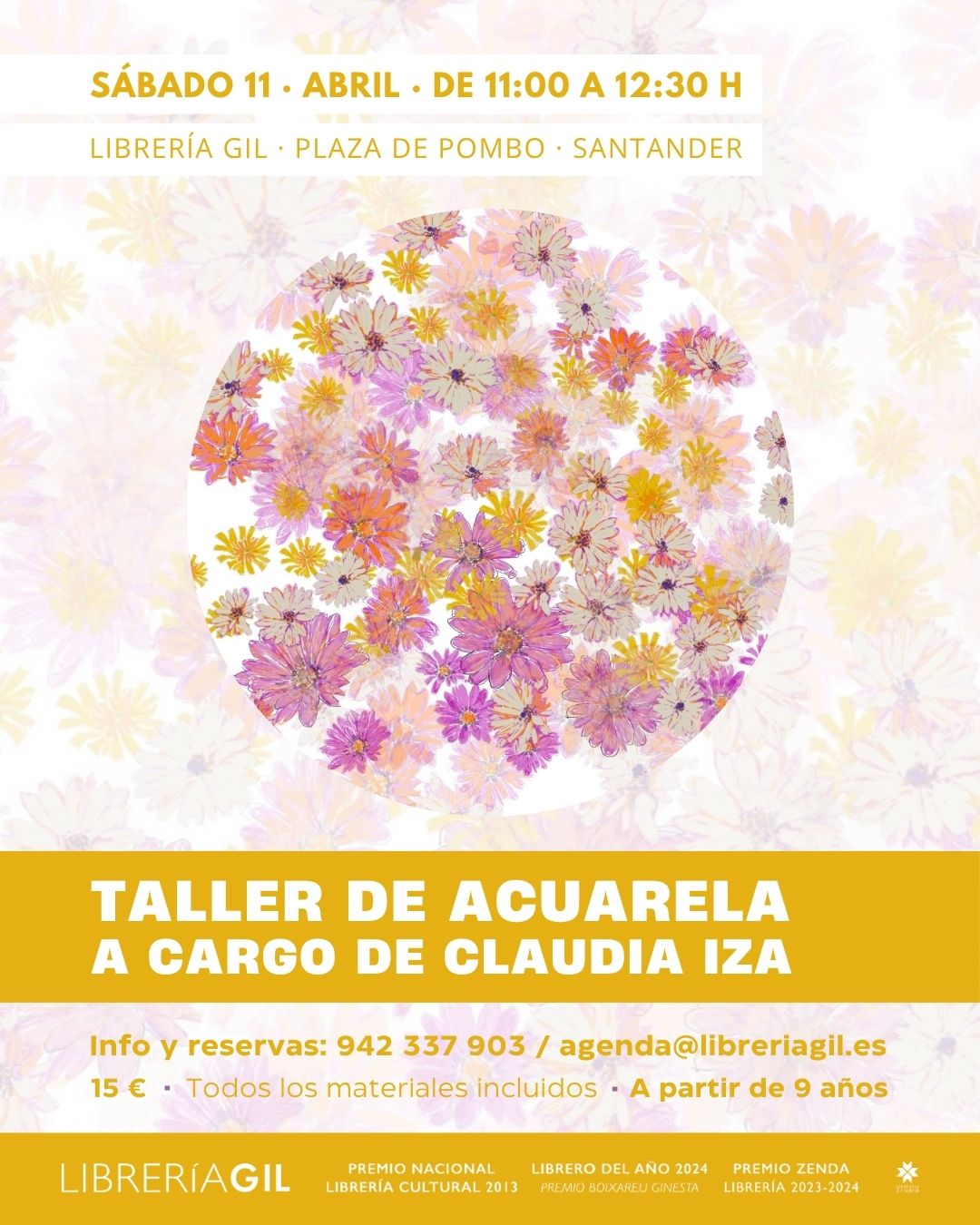 Taller de acuarela para adultos a cargo de Claudia Iza. el sábado 11 de abril, de 11:00 h a 12:30h. Todos los materiales incluidos. Precio: 15€. Imprescindible reservar plaza en: 942 337903/ info@libreriagil.es