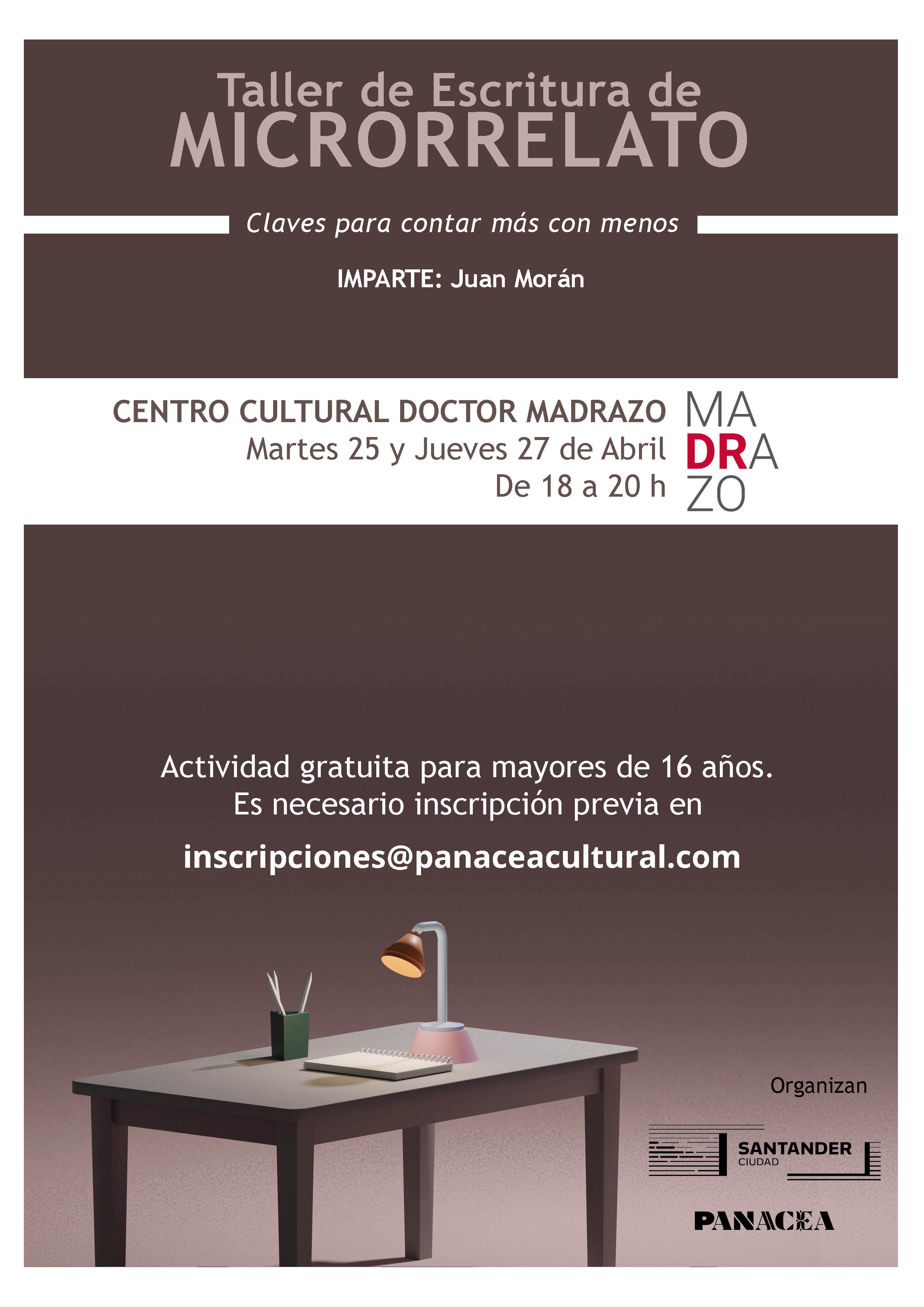 Los días 25 y 27 de abril, tendrá lugar en el Centro Cultural Madrazo un Taller de Escritura de Microrrelato, coordinado por PANACEA y dirigido a mayores de 16 años. El taller, que estará a cargo de Juan Morán, comenzará a las 18:00h y tendrá una duración de dos horas cada día.
