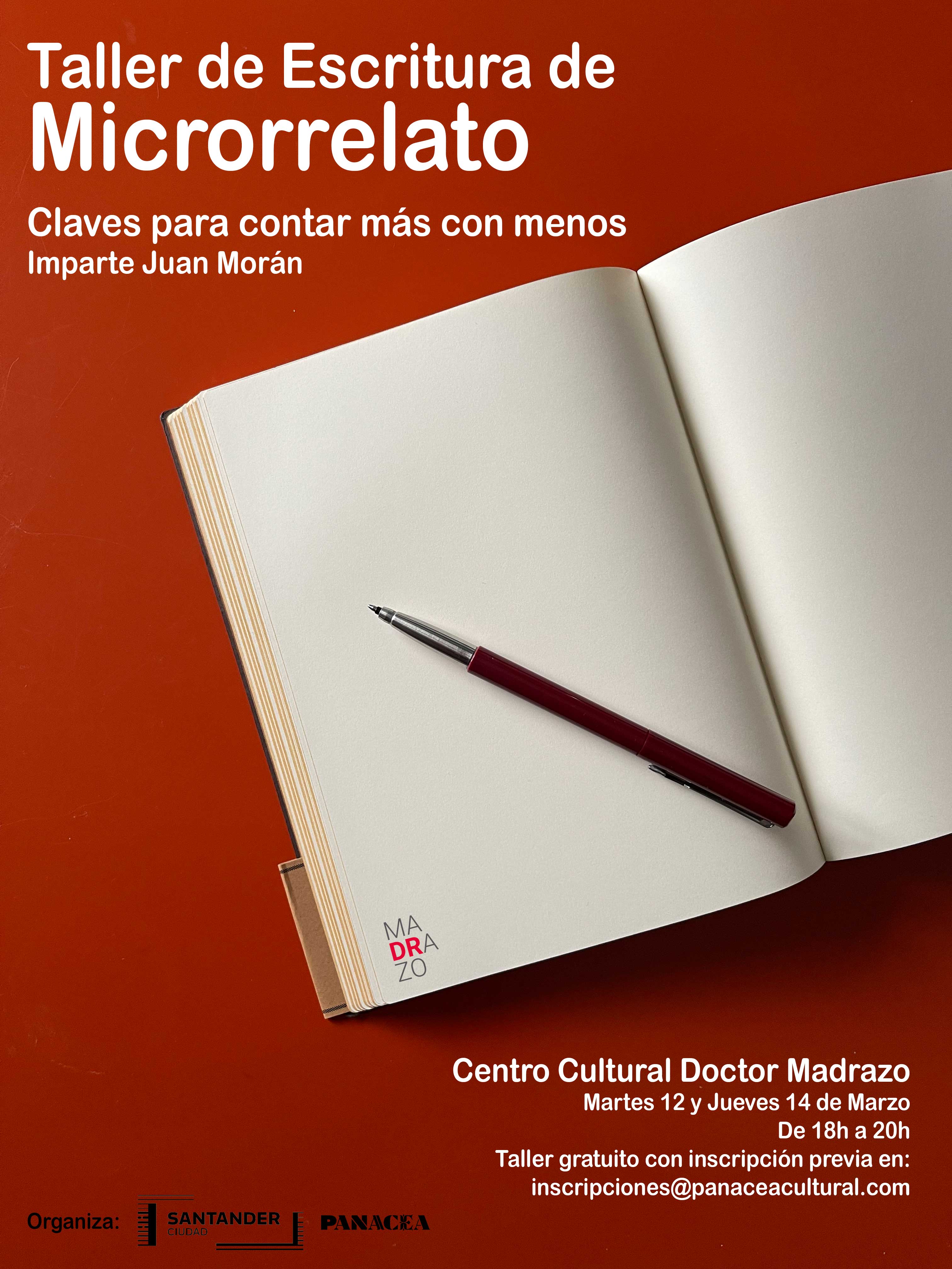 Los días 12 y 14 de marzo, tendrá lugar en el Centro Cultural Madrazo un nuevo Taller de Escritura de Microrrelato, coordinado por PANACEA y dirigido a mayores de 16 años. El taller, que estará a cargo de Juan Morán, comenzará a las 18:00h y tendrá una duración de dos horas por sesión.