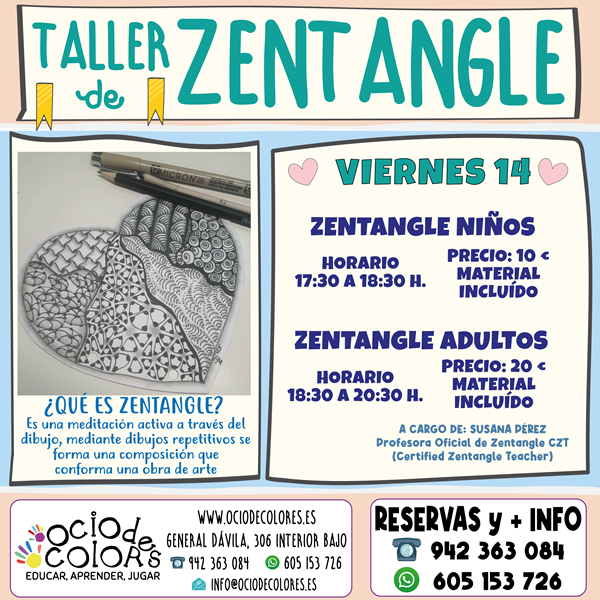 Desde Ocio de Colores han organizado un Taller de Zentangle especial San Valentín para niños y adultos. El Zentangle es una práctica que combina el arte y la meditación. Esta técnica, cuyo nombre fusiona las palabras "zen" (que evoca serenidad) y "tangle" (enredo), se basa en la creación de patrones abstractos a través del dibujo.