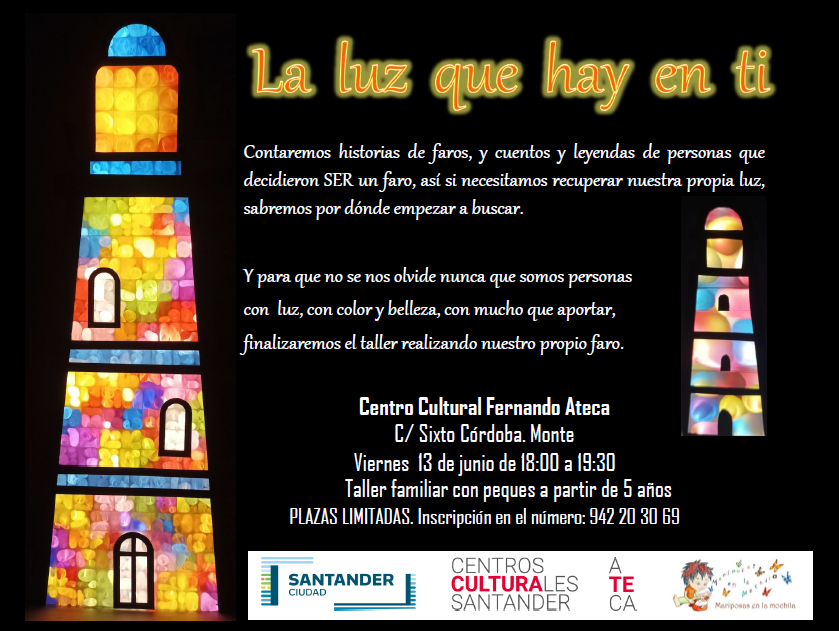 El viernes 13 de junio, entre las 18:00 h y las 19:30 h, tendrá lugar, en el centro cultural Fernando Ateca, el taller “La luz que hay en ti”, a cargo de Cruz Celis / Mariposas en la mochila. Está dirigido a familias con niños a partir de 5 años, y para asistir es necesario realizar inscripción previa llamando al teléfono 942 20 30 69.