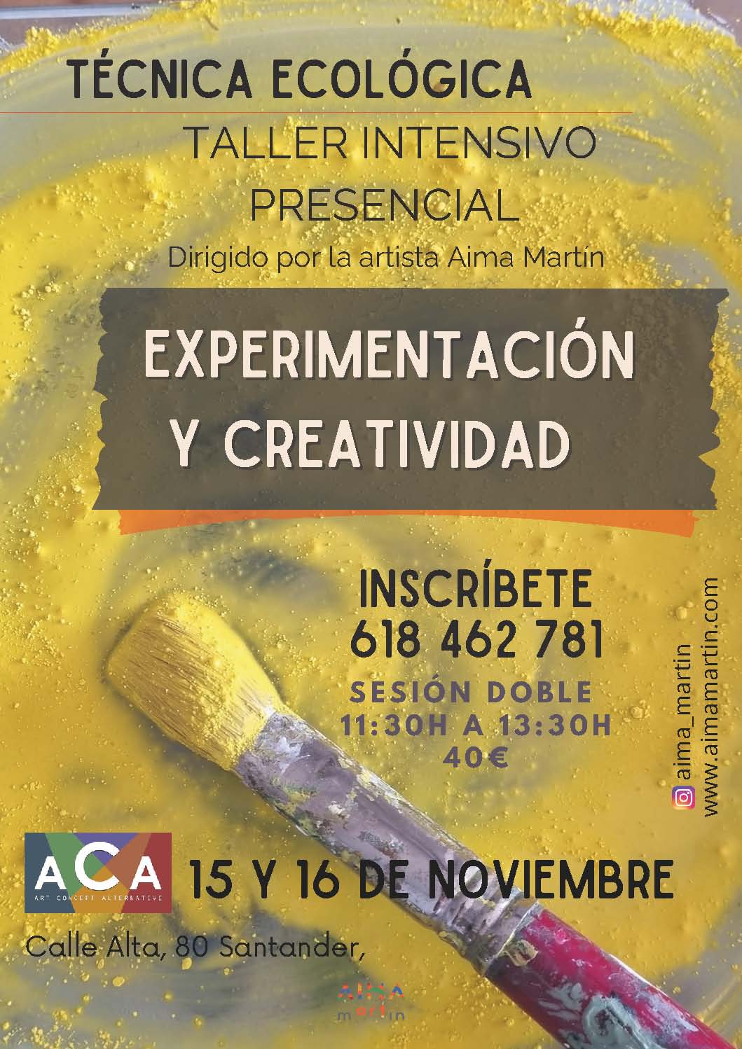 Taller Intensivo de Experimentación y Creatividad, dirigido por la artista multidisciplinaria y docente, Aima Martín. Se impartirá en sesión doble, los días 15 y 16 de noviembre, de 11:30 a 13:30 h en Art Concept Alternative ACA.