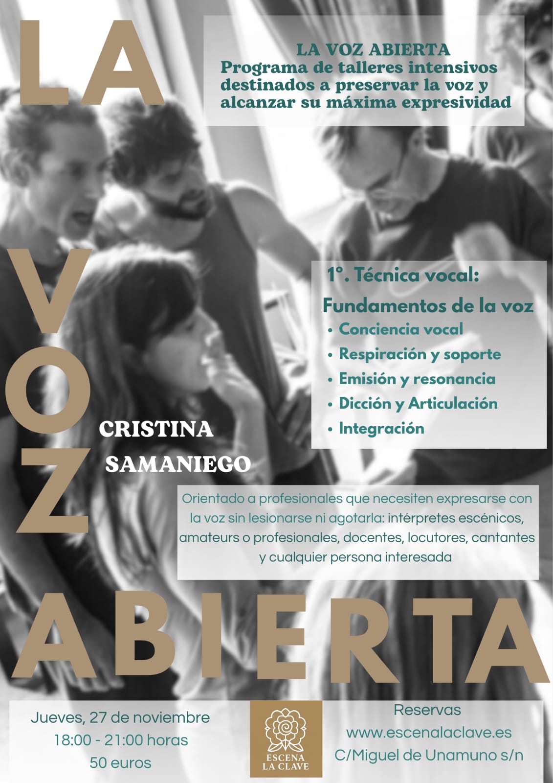 Taller intensivo “La voz abierta”, impartido por Cristina Samaniego el jueves 27 de noviembre, de 18:00 a 21:00h en Escena La Clave.