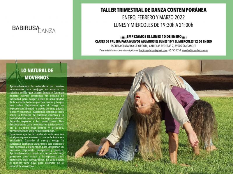 Rafael de la Lastra y Beatriz Palenzuela, componentes de Babirusa Danza, imparten un taller de danza contemporánea durante el primer trimestre de 2024. Las clases se desarrollarán los lunes y miércoles de 19:30 a 21:00 horas en el Centro profesional de danza Belén Cabrillo.