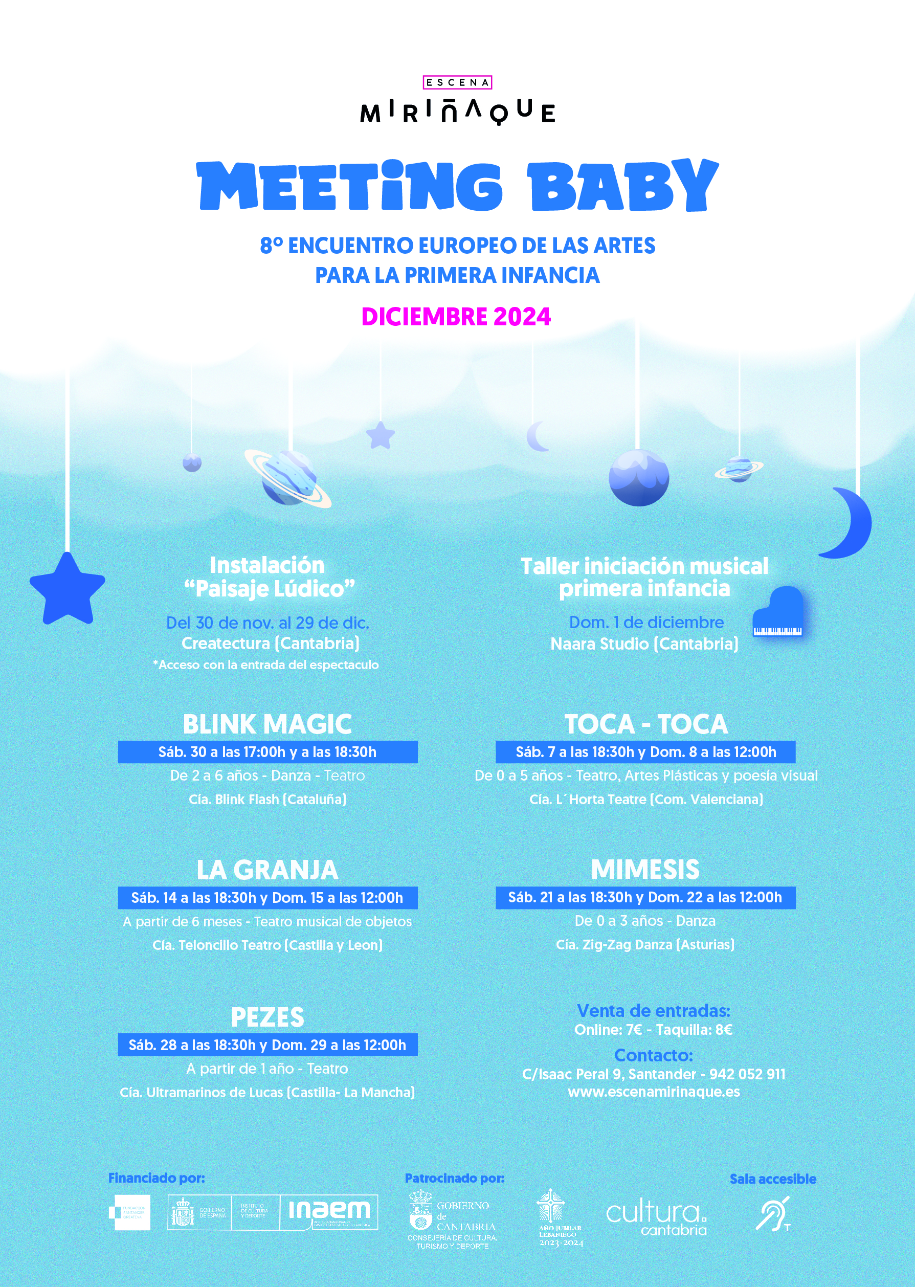 La VIII Edición del Meeting Baby cuenta con una programación diseñada, un año más, para espectadores de 0 a 6 años. Toma al bebé como espectador del presente y no del futuro, y reivindica su derecho a formar parte de aquellos procesos artísticos que pueden favorecer su inteligencia emocional y desarrollar sus habilidades.
