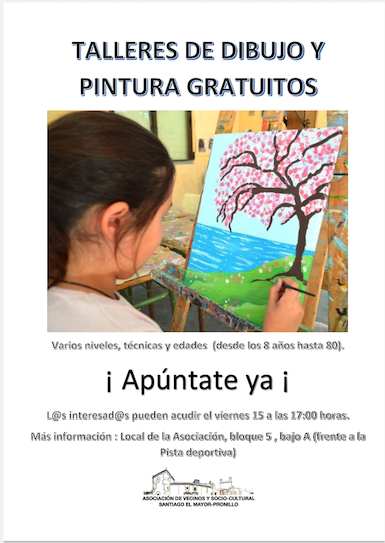 La Asociación de Vecinos Santiago el Mayor Pronillo ofrece talleres gratuitos de dibujo y pintura todos los lunes de 17 a 19 horas. Dirigidos a personas a partir de 8 años, los talleres están impartidos por Pilar Aranda.