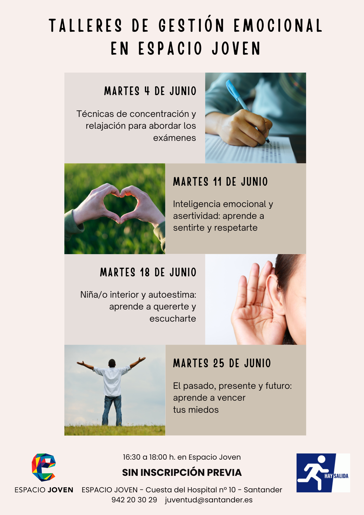 Los temas que se tratarán serán los siguientes: ‘Técnicas de concentración y relajación para abordar los exámenes’ (4 de junio); ‘Inteligencia emocional y asertividad: Aprende a sentirte y respetarte’ (11 de junio); ‘Niño/a interior y autoestima: Aprende a quererte y escucharte’ (18 de junio); y ‘El Pasado, el presente y el futuro: Aprende a vencer tus miedos’ (25 de junio).