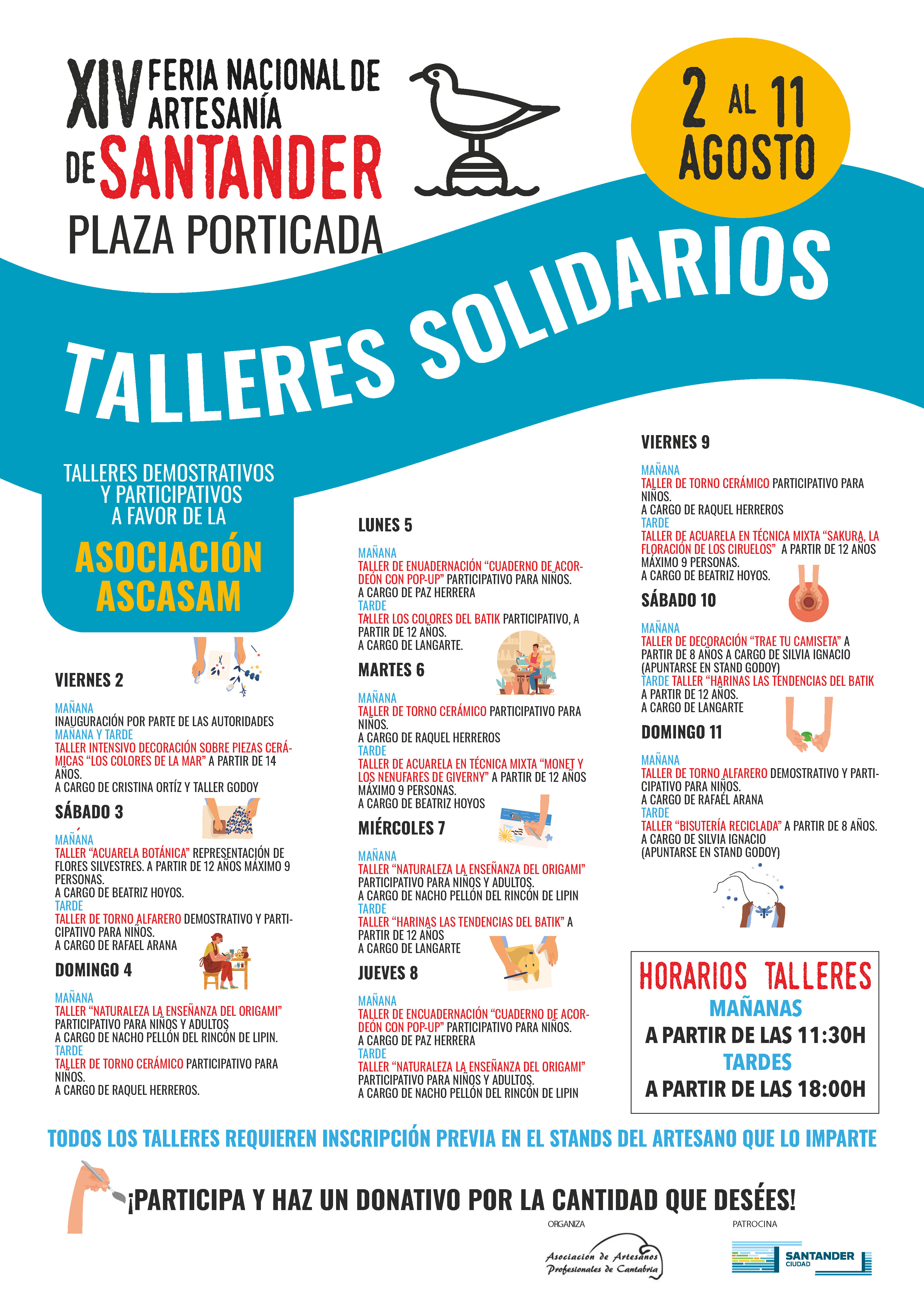 Talleres solidarios impartidos por los propios artesanos nos permitirán aprender técnicas ancestrales y poner a prueba nuestra propia creatividad. Estos talleres, gratuitos previa inscripción, se llevarán a cabo en horario de mañana (11:30 horas) y de tarde (18:00 horas), y los participantes podrán realizar un donativo a favor de la asociación ASCASAM, demostrando su compromiso con la comunidad.