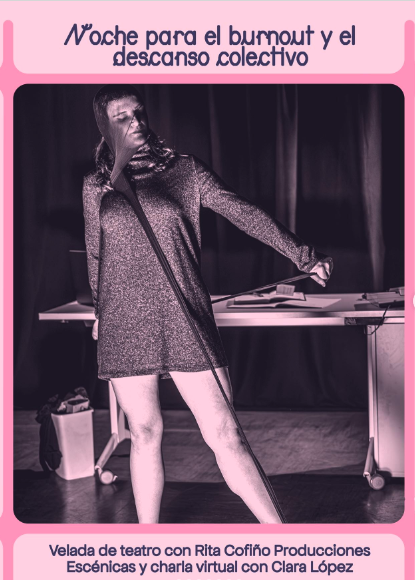 La noche comenzará con la obra “Recursos humanos” dirigida por Rita Cofiño Producciones Escénicas, interpretada por Lucía Alvear y escrita por Aurora Díaz Obregón. Una pieza sobre el malestar psicológico en el trabajo y la imposibilidad de cuidar(se) dentro de los engranajes empresariales.