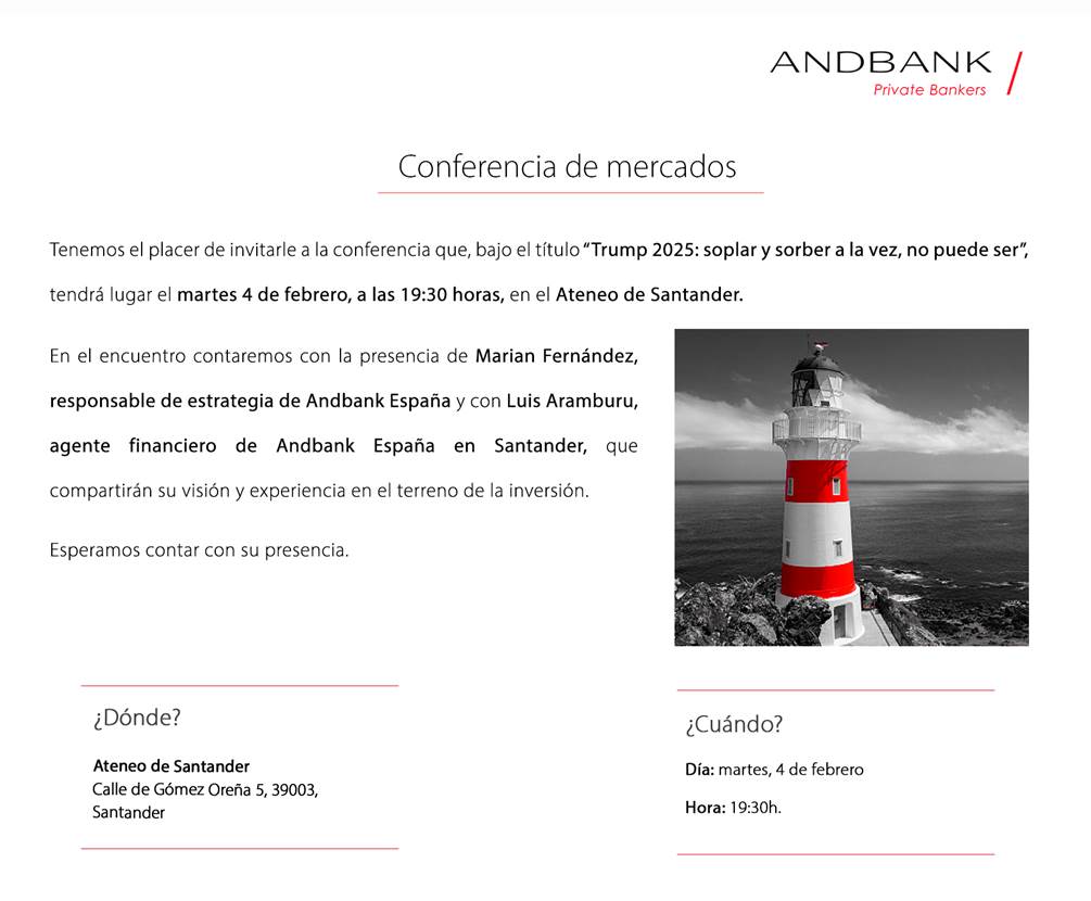 Estas y otras cuestiones se tratarán, en un lenguaje claro y sencillo, en la reunión “Trump 2025: soplar y sorber a la vez, no puede ser”, que tendrá lugar el próximo 4 de febrero a las 19,30 en el Ateneo de Santander, junto con Marian Fernández, responsable de estrategia de Andbank España y con Luis Aramburu, agente financiero de Andbank.