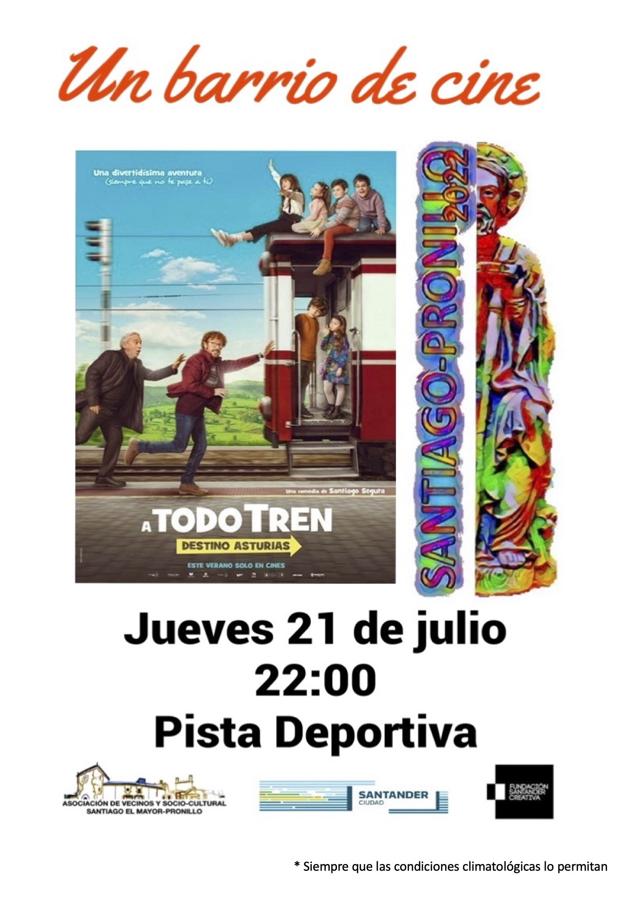La Asociación de Vecinos del Barrio Santiago El Mayor-Pronillo organiza, con el apoyo de la Fundación Santander Creativa, una sesión de cine al aire libre en la pista deportiva el jueves 21 de julio a las 22:00 h. La película que se proyectará es “A todo tren. Destino Asturias”, de Santiago Segura.