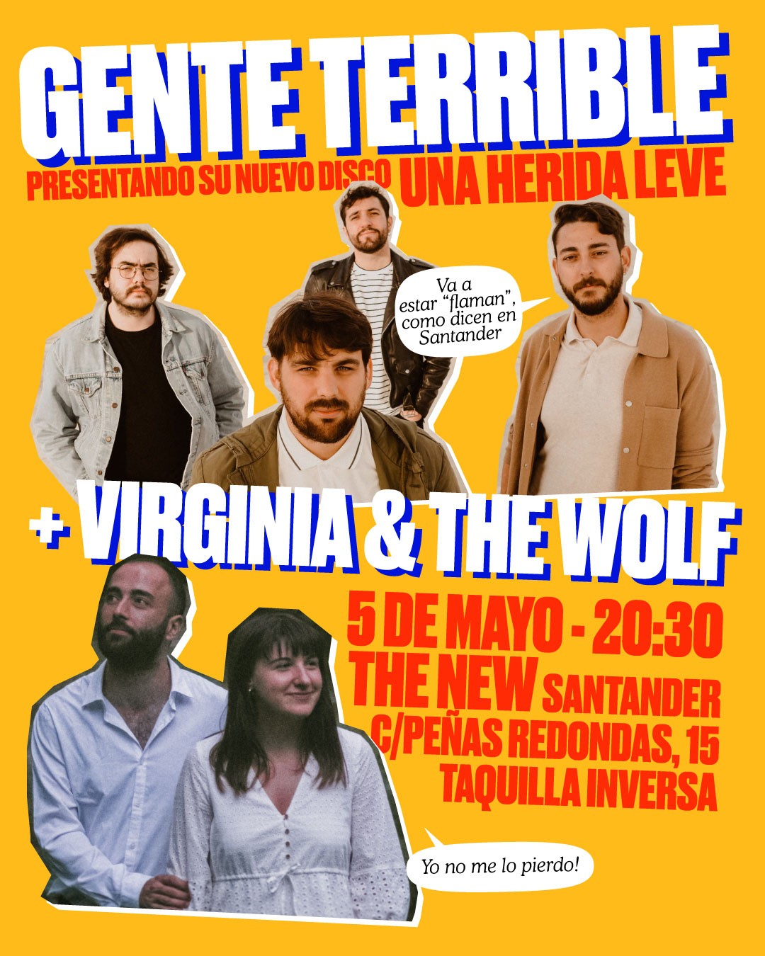El 5 de mayo, Gente Terrible y Virginia & the Wolf se subirán a las tablas de la sala santanderina Rock Beer The New para presentar su último larga duración. Los dos nombres asturianos van de la mano para dar vida a sus propuestas musicales: una, la del conjunto, con letras costumbristas y conceptuales sobre los dolores del crecer, envueltas en una estética que se mueve en el espacio indie-folk que hay entre el pop y el rock. La otra, la de la pareja formada por Paula Argüeso y Antonio Irún, despliega sus temas en una estética vaporosa con la que exploran aspectos tan vitales como la salud mental.