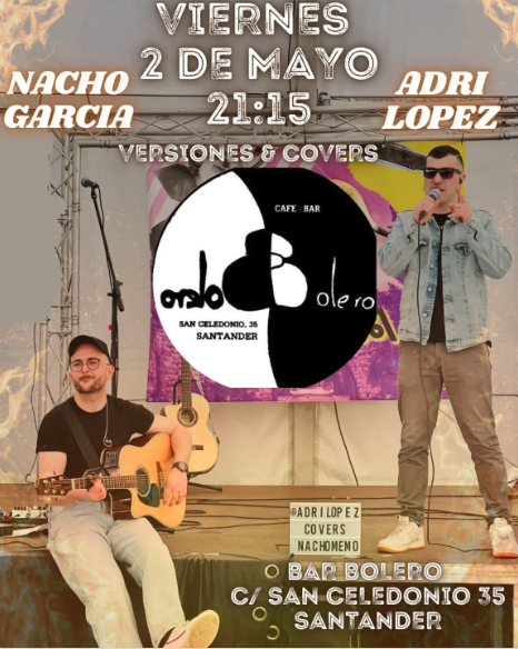 Versiones con Nacho García y Adri López en el Café/Bar Bolero el viernes 2 de mayo a las 21:15h.
