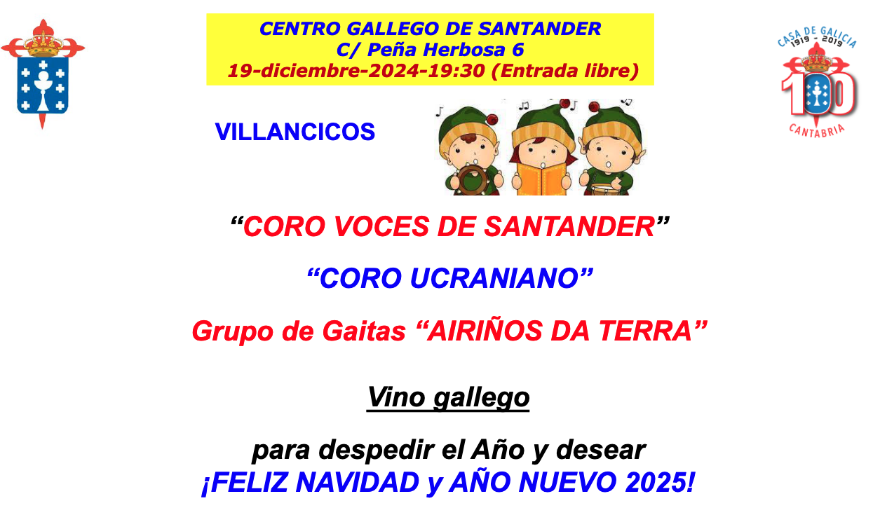 El jueves 19 de diciembre, a las 19:30 horas, el Coro Voces de Santander y el Coro Ucraniano, acompañados por el grupo de gaitas Airiños da Terra, ofrecerán un recital de villancicos en el Centro Gallego de Santander.