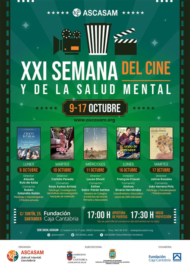 Un año más, ya son 21 ediciones, ASCASAM organiza las jornadas de Cine y Salud Mental en Santander. En estas se proyectan 5 películas y posteriormente, una persona especializada en salud mental realizará un coloquio sobre la película, relacionándola con la salud mental y dando lugar a una interacción fluida con el público asistente.