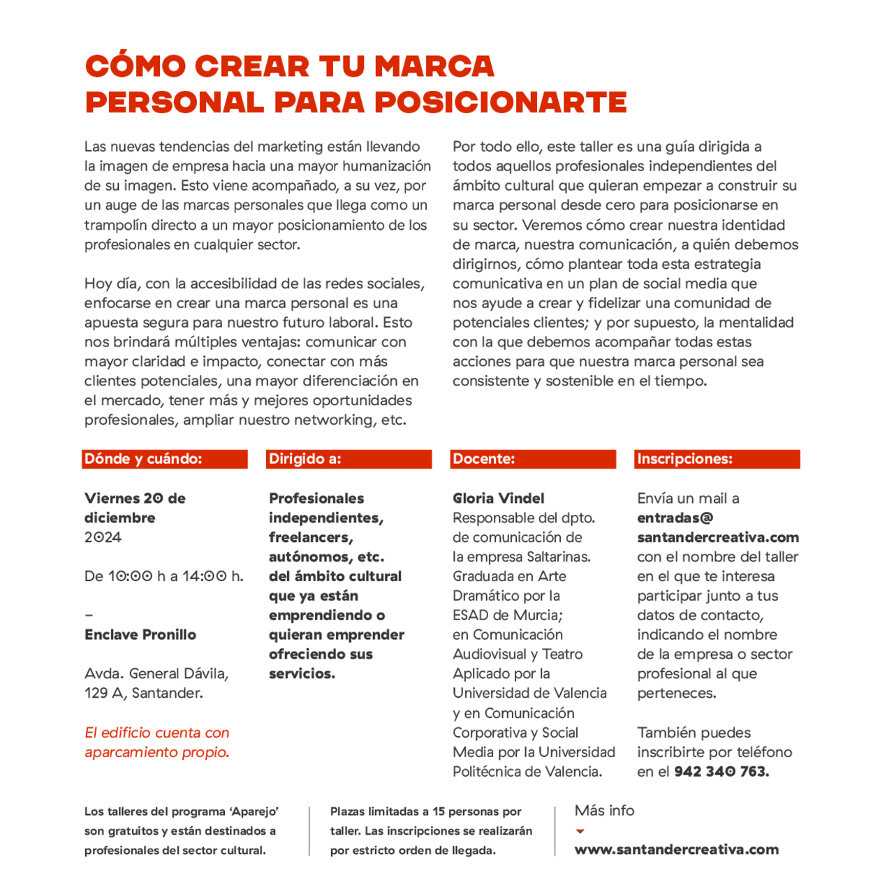 El programa de formación “Aparejo” que organiza la Fundación Santander Creativa (FSC) ofrecerá el próximo 20 de diciembre en Enclave Pronillo, un curso gratuito dirigido a los profesionales de la cultura local sobre cómo construir una marca personal “interesante y sostenible” que mejore su posicionamiento en el sector.