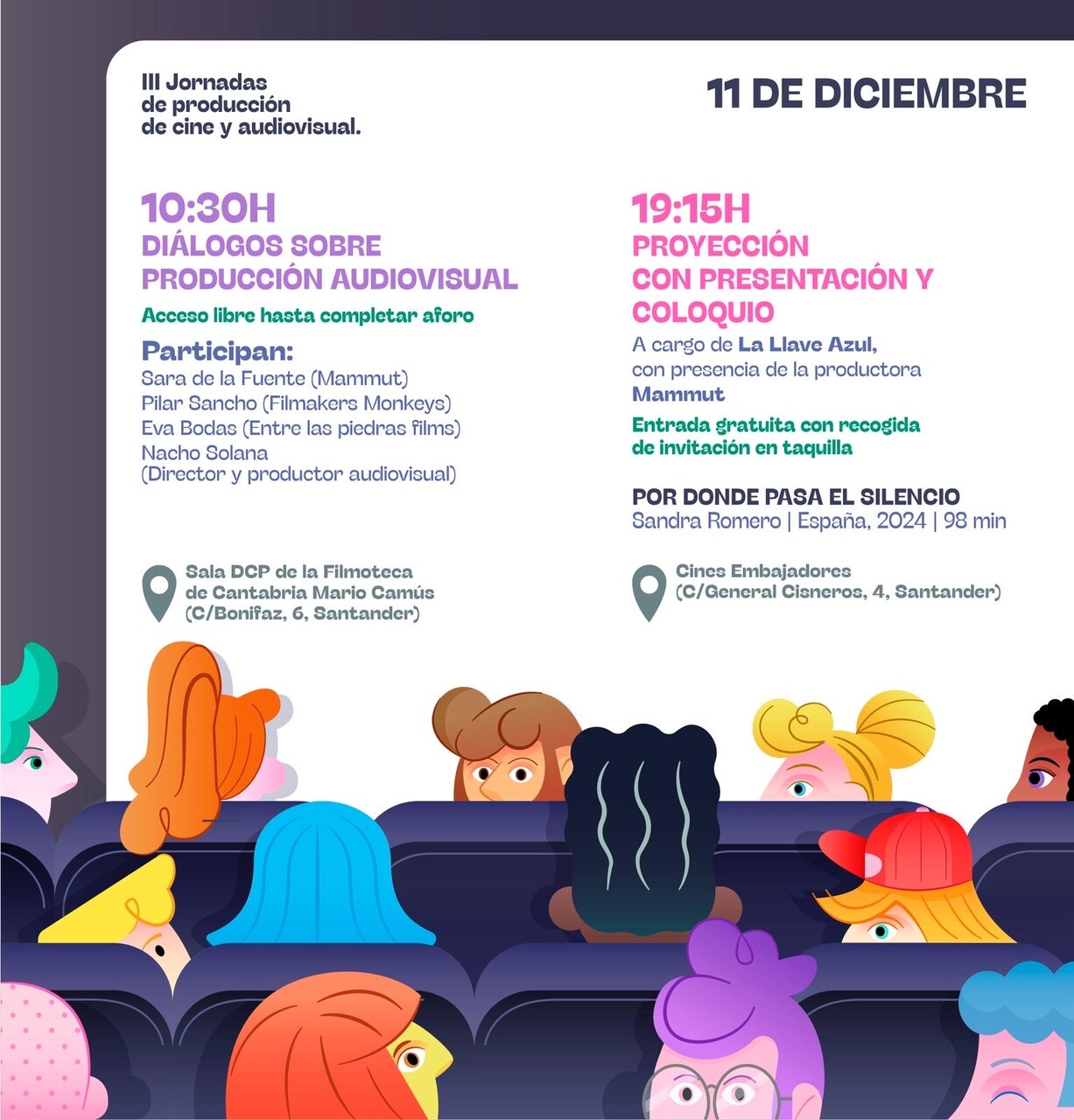 El programa se trasladará a la Filmoteca de Cantabria Mario Camus y allí, a las 10:30 horas, se celebrará “Diálogos sobre producción audiovisual”, un encuentro abierto al público y dirigido por Nacho Solana junto a las tres productoras invitadas: Sara de la Fuente, Pilar Sancho y Eva Bodas.