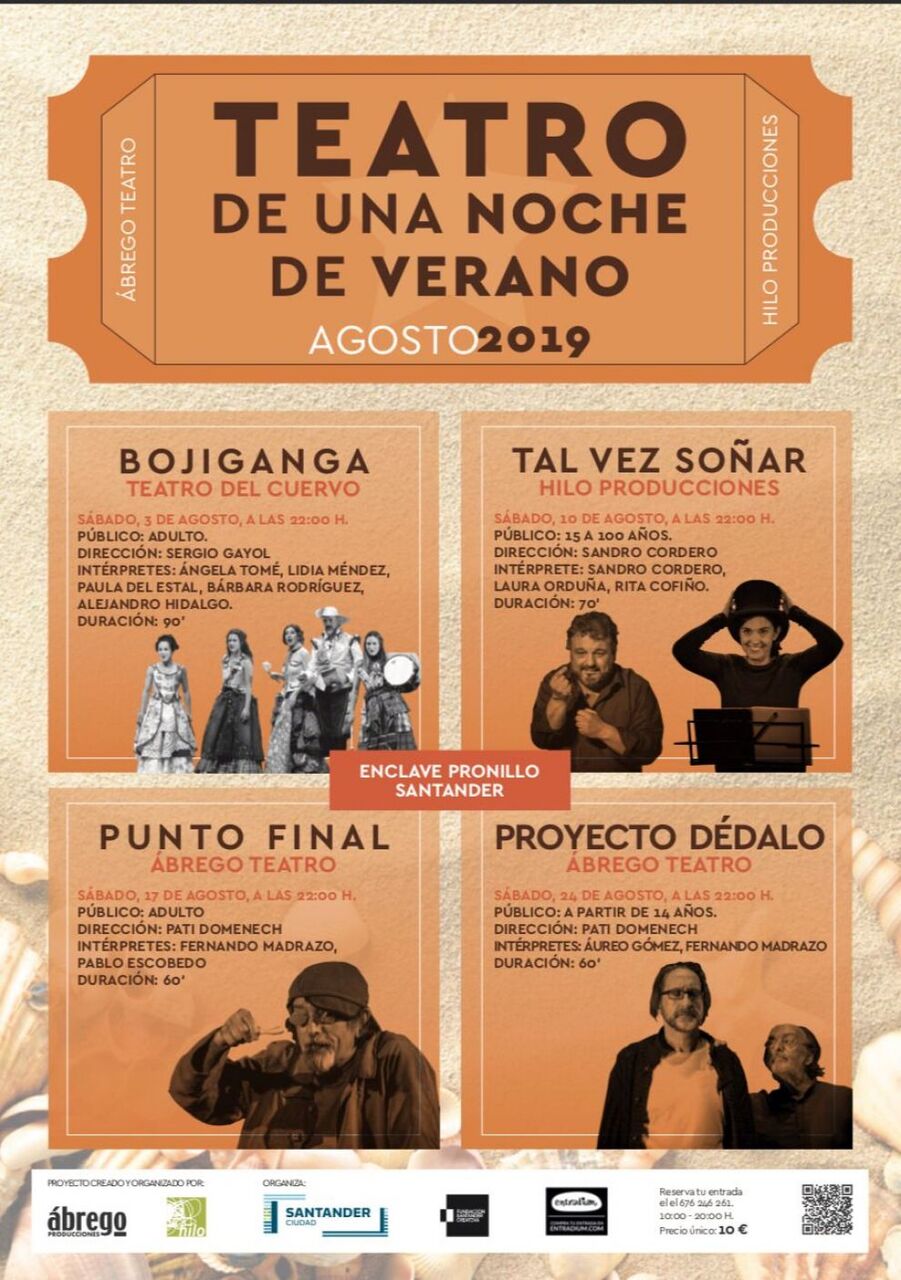 En total, cuatro representaciones que podrán verse en la ciudad a partir del viernes -3 de agosto- y que después, partirán a otros lugares de Cantabria como el Palacio de Albaicín de Noja y el Instituto de Educación Secundaria Ataúlfo Argenta de Castro Urdiales. Creado y organizado por Hilo y Ábrego con el apoyo de la FSC, el ciclo ha logrado asentarse dentro de la programación cultural que la ciudad ofrece en verano gracias, por una parte, a la diversidad y la calidad de los espectáculos y, por otra, a las novedades que introducen en cada edición.